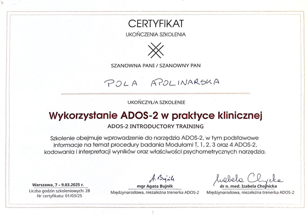 Pani Pola od samego początku stworzyła bardzo spokojną i bezpieczną atmosferę. Mówiła w sposób empatyczny i cierpliwy, nie przerywała, dawał mi czas na odpowiedzi. Podczas całego procesu diagnozy czułam, że jestem traktowana z szacunkiem i zrozumieniem. Pytania były konkretne, ale nie przytłaczające. Miałam poczucie, że Pani Pola naprawdę stara się zrozumieć, jak funkcjonuję na co dzień.