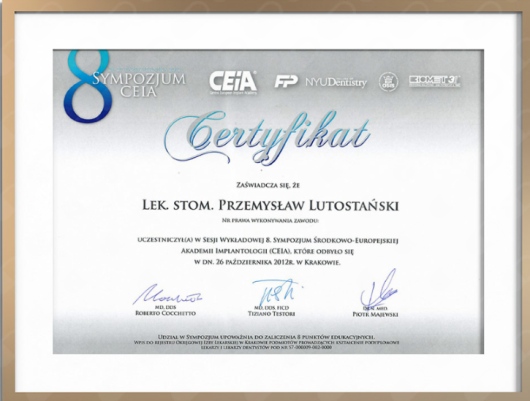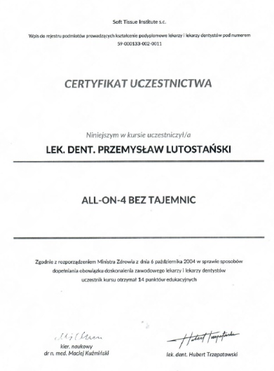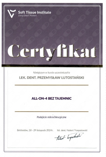 Polecam z całego serca. Gdybym wcześniej na swojej drodze spotkała Pana Doktora Lutostańskiego to dziś prawdopodobnie cieszyłaby się wspaniałym uśmiechem. Fachowa analiza i zaplanowanie całego leczenia daje poczucie pewności i profesjonalizmu. Bałam się tego co mnie czeka ale zupełnie niepotrzebnie ponieważ Pan Doktor przy skomplikowanym usunięciu wielu zębów (a raczej ich resztek) sprawił ze nie tylko nie czułam absolutnie żadnego bólu czy dyskomfortu to jeszcze spędziłam ten czas w sympatycznej miłej i przede wszystkim empatycznej atmosferze. Co ważne profesjonalne podejście Pana Doktora już w pierwszych chwilach wizyty sprawiło ze przestałam czuć zakłopotanie z powodu stanu uzębienia. Można by długo pisać, wspaniały i przemiły człowiek, kompetentny i zaangażowany lekarz, a to wszystko połączone bardzo rozsądnym cennikiem. Polecam z całego serca.