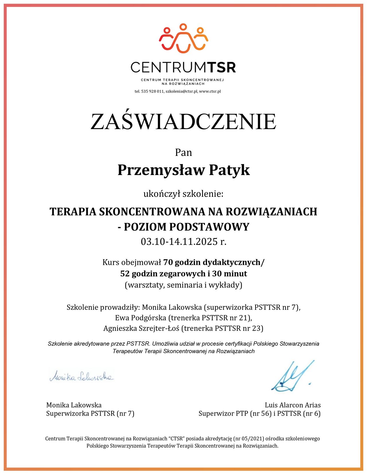 Ukończyłem również szkolenie I stopnia Terapii Skoncentrowanej na Rozwiązaniach (TSR). Planuję dalszy rozwój w tym nurcie oraz rozpoczęcie szkolenia w szkole psychoterapii poznawczo-behawioralnej.
