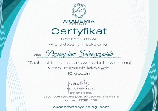 Chciałbym bardzo podziękować Przemkowi za dziewięć miesięcy wspólnej pracy terapeutycznej. W tym czasie otrzymałem od niego nie tylko wsparcie, ale przede wszystkim konkretne narzędzia, które pomogły mi zmierzyć się z depresją i brakiem pewności siebie. Dzięki terapii lepiej rozumiem swoje emocje, potrafię radzić sobie z trudnymi momentami i patrzeć na siebie z większą życzliwością. Ważne było też nauczenie się stawiania zdrowych granic – zwłaszcza w pracy – co daje mi poczucie spokoju i kontroli. Istotnym etapem była również praca nad traumami z dzieciństwa. Dzięki wsparciu Przemka mogłem spojrzeć na nie w nowy sposób, oswoić je i stopniowo uwalniać się od ich ciężaru. Doceniam jego cierpliwość, profesjonalizm i stworzoną atmosferę zaufania. Dziś czuję się silniejszy i lepiej przygotowany do dalszego rozwoju. Z całego serca polecam terapię u Przemka każdemu, kto potrzebuje wsparcia i drogi do większej równowagi.