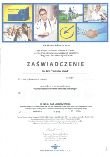 Członek polskiego towarzystwa chirurgii stomatologicznej i szczękowo-twarzowej.