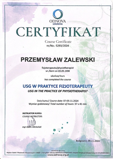 Magister fizjoterapii, absolwent Wyższej Szkoły Fizjoterapii we Wrocławiu. Specjalizuję się w rehabilitacji : -ortopedyczne -pourazowej -pooperacyjnej -stanach przeciążeniowych -bólu stawu skroniowo żuchwowego. Na codzień korzystam z połączenia terapii manualnej, suchego igłowanie i pinopresury. Dodatkowo wspieram się nowoczesną fizykoterapią: fala uderzeniowa, fala radiowa Indiba. W trakcie diagnostyki jeśli istnieje taka potrzeba jest możliwość skorzystania z aparatu do USG. W pracy skupiam równie mocno na edukacji Pacjenta. Kursy: USG w praktyce fizjoterapeuty Terapia Manualna Kaltenborna i Evjenth’a - UEX, OEX, UWS (kończyna dolna,kończyna górna, kręgosłup lędźwiowy) Suche Igłowanie Akupunktura Neurofunkcjonalna Pinopresura Wykorzystanie USG w praktyce zawodowej fizjoterapeuty Manualne Testy Mięśniowe Stopa w koncepcji Global System Patterns Badanie z wnioskowaniem klinicznym oraz terapia kręgosłupa szyjnego Stopa w ujęciu naczyniowym (GTS®) Manualne leczenie zaburzeń autonomicznego układu nerwowego. Exos Performance Specialist Certification