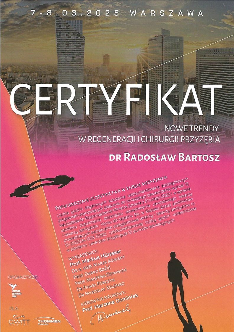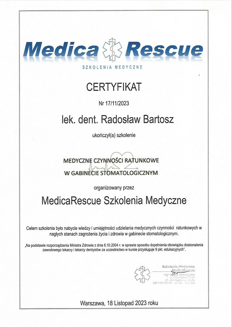 Zdecydowanie nie polecam. Pośpiech, arogancja i słaby kontakt z pacjentem. Cały zabieg wyrwania dwóch ósemek trwał niecałe 20 minut - i to licząc z rozmową przed i po. Bolało już wkłucie znieczulenia, podczas ekstrakcji kilka razy poczułem silny ból z nerwu. Nie dostałem wytycznych co do zachowania po wyjściu z gabinetu. Prawie zapaliłem przez to papierosa, ale coś mnie tknęło i na szczęście sprawdziłem, że grozi to nieprzyjemnymi komplikacjami. O wszystko, co przyszło mi do głowy, musiałem wypytać, łącznie ze stosowaniem antybiotyku. Dostałem odpowiedź, że "zgodnie z ulotką", a na ulotce - że zgodnie z zaleceniami lekarza. Z pośpiechu pan Bartosz wszył mi nierozpuszczalne szwy, mimo że powiedział, że są rozpuszczalne. Przez 2 tygodnie miałem twarz spuchniętą jak balon, cały czas czułem ból. Złe szwy zauważyła dopiero higienistka podczas naświetlania, które miało zmniejszyć ból i opuchliznę. Byłem chyba ostatnim pacjentem i pani z recepcji 30 minut przed wizytą dzwoniła, czy nie mógłbym być wcześniej, co znaczy, że pan Bartosz musiał po prostu jak najszybciej wyjść. Niestety kosztem jakości wizyty. Dodatkowo miał arogancko-nieprzyjemny sposób bycia, był też niezbyt miły dla higienistki. Generalnie czułem się jakbym był u dentysty z NFZ i wiele się namęczyłem później, gdy dziąsła nie goiły się i bolały przez złe szwy.