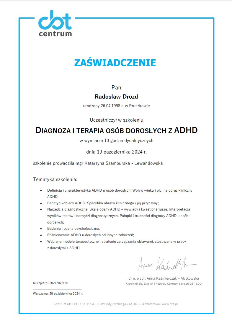 Jaki jest zakres porad oferowanych przez Radosław Drozd?Radosław Drozd to psycholog. Na podstawie swojego doświadczenia i wykształcenia Radosław Drozd oferuje usługi takie jak: Konsultacja psychologiczna, diagnoza ADHD dla dorosłych, konsultacja diagnostyczna, Badanie ADOS - 2, Konsultacja psychologiczna online.