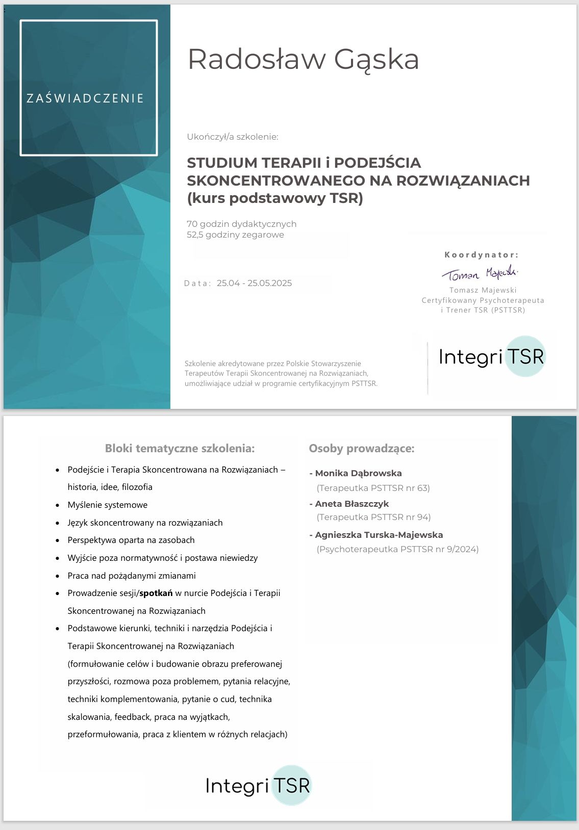 By jeszcze bardziej móc wychodzić naprzeciw Państwa potrzebom studiuję w 4-letniej szkole psychoterapii w nurcie poznawczo - behawioralnym. Mam ukończony I stopień Terapii Skoncentrowanej na Rozwiązaniu.