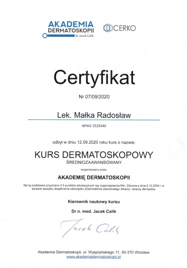 Dermatoskopia jest badaniem stosowanym do oceny znamion barwnikowych, powszechnie nazywanych pieprzykami. Ta metoda zwiększa możliwość rozpoznania czerniaka w bardzo wczesnym stadium rozwoju, wtedy, gdy można ten nowotwór łatwo wyleczyć. Ponadto ułatwia odróżnienie czerniaka złośliwego od innych, niegroźnych zmian na skórze. Jest badaniem bezinwazyjnym, dzięki czemu jest w pełni bezpieczna i bezbolesna dla pacjenta.