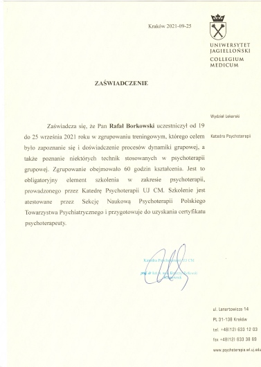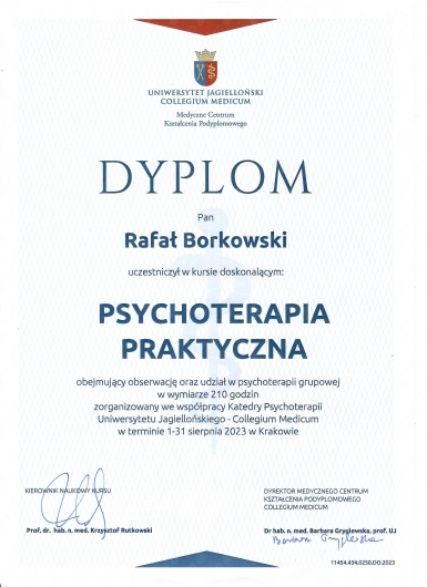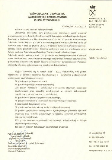 Ukończyłem 5-letnie studia magisterskie z psychologii na KUL oraz 4-letnie, całościowe, szkolenie w psychoterapii organizowane przez Katedrę Psychoterapii Collegium Medicum Uniwersytetu Jagiellońskiego (CM UJ), atestowane przez Polskie Towarzystwo Psychiatryczne, gdzie też finalizuję proces ubiegania się o certyfikat psychoterapeuty PTP. Swoją wiedzę miałem okazję poszerzać m. in. odbywając część studiów z psychologii na Univesity of Nicosia (Cypr). Doświadczenie zawodowe zdobywałem m. in. na OLZON oraz w Zakładzie Psychoterapii SU w Krakowie (por. niżej). Obecnie, przyjmuję prywatnie oraz na NFZ w ramach Poradni psychologiczno-psychoterapeutycznej dla dzieci i młodzieży Euro-Medica. Przyjmuję pacjentów od 14 r. ż. Swoją pracę poddaję regularnej superwizji u certyfikowanych superwizorów PTP, minimum dwa razy w miesiącu. Jestem wpisany na Listę psychoterapeutów i superwizorów PTP.