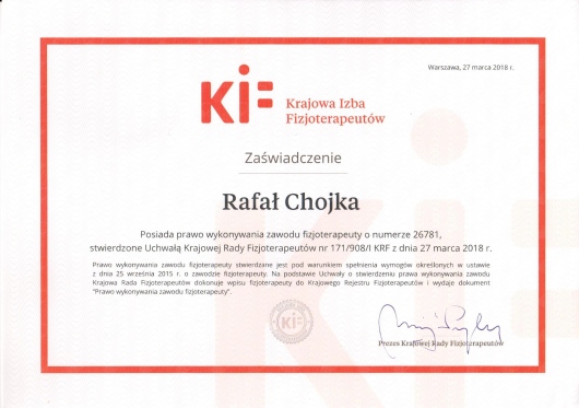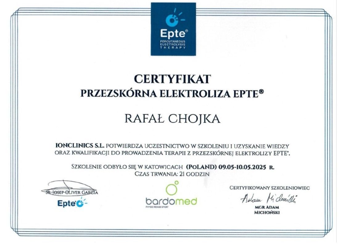 Jaki jest zakres porad oferowanych przez Rafał Chojka?Rafał Chojka to fizjoterapeuta. Na podstawie swojego doświadczenia i wykształcenia Rafał Chojka oferuje usługi takie jak: INDIBA terapia, rehabilitacja neurologiczna, kinezyterapia, Fizjoterapia po udarach w chorobach OUN, terapia wisceralna, Rehabilitacja z egzoszkieletem, konsultacja fizjoterapeutyczna (pierwsza wizyta), Terapia czaszkowo-krzyżowa, rehabilitacja ortopedyczna, konsultacja fizjoterapeutyczna.
