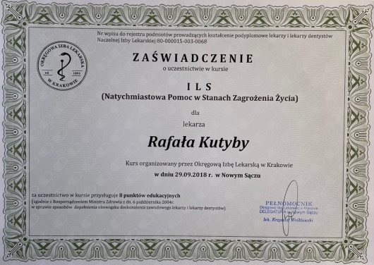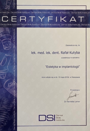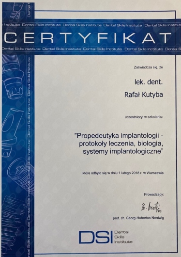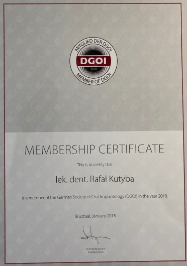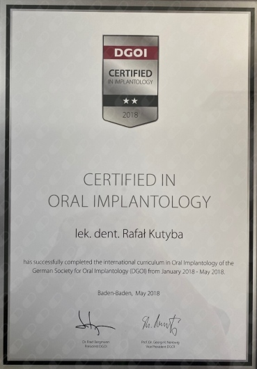 W 2018 roku zdał międzynarodowy egzamin implantologiczny DGOI, potwierdzający uprawnienia implantologiczne.