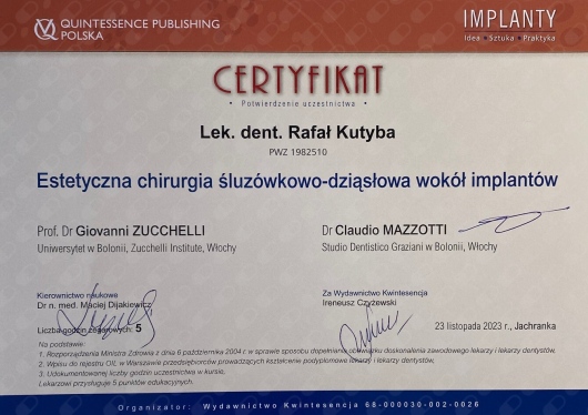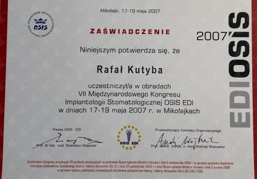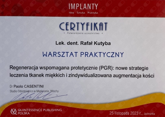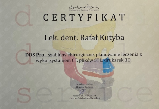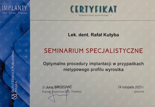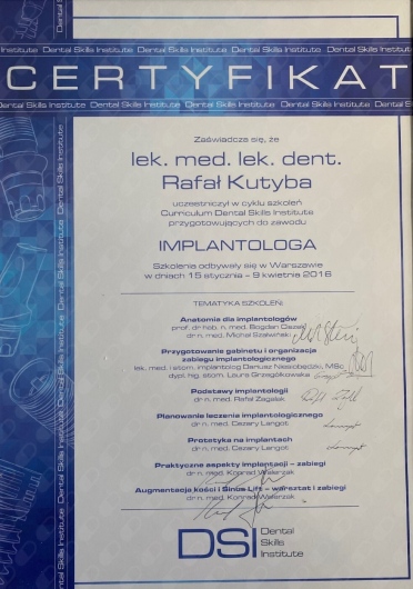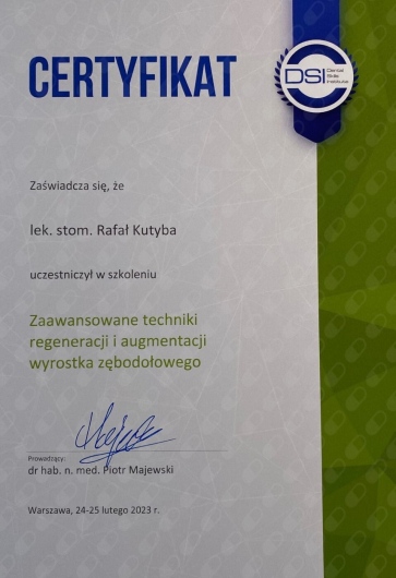 W 2015 roku ukończył Curriculum Implantologiczne DSI w Warszawie.