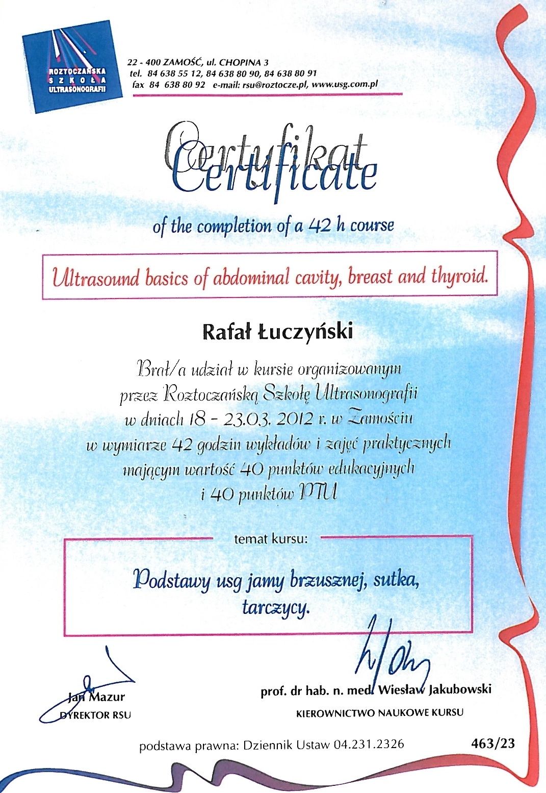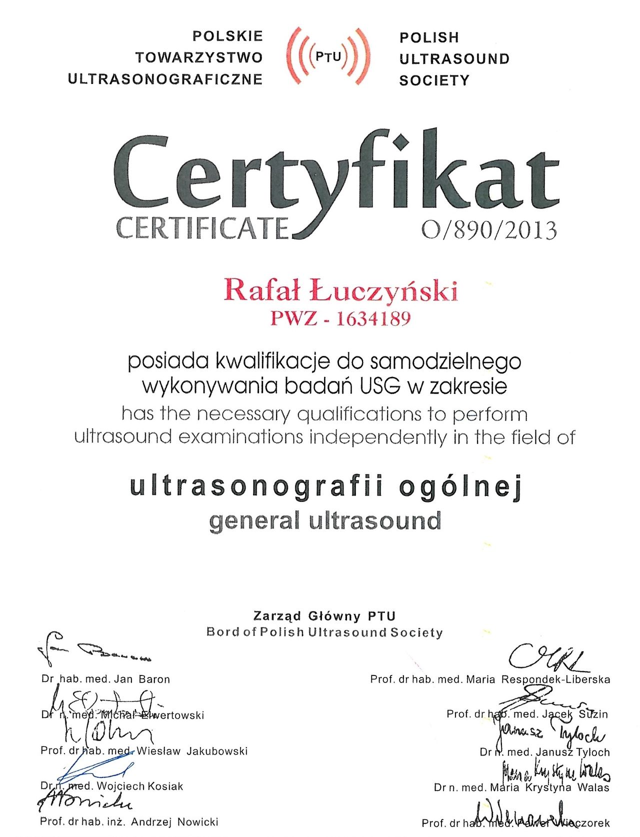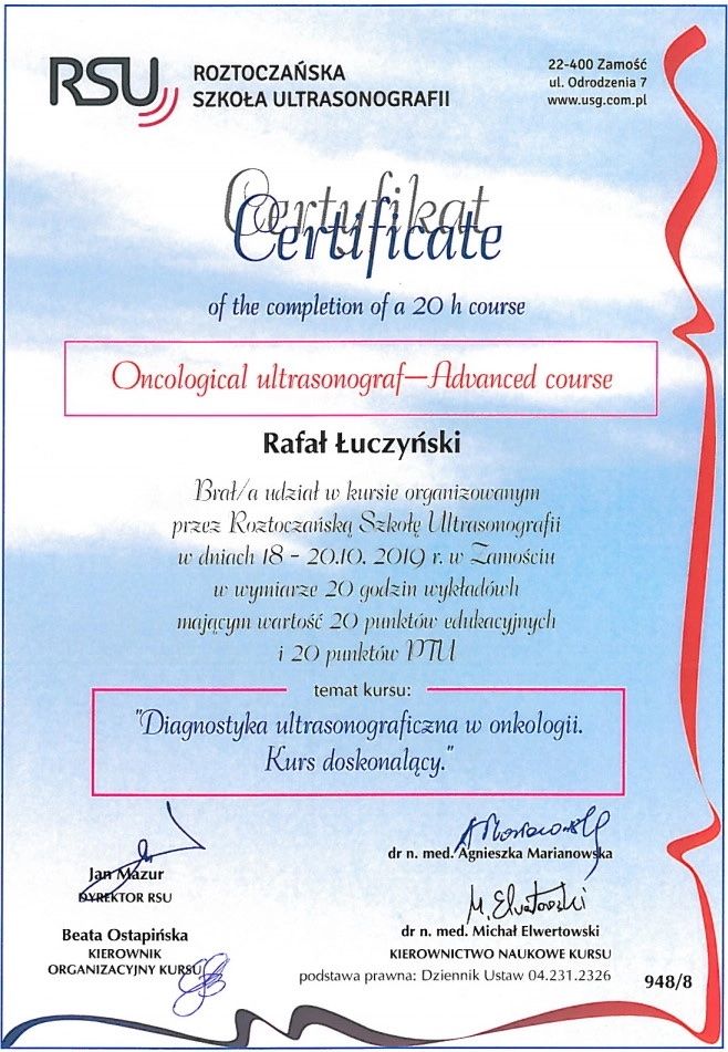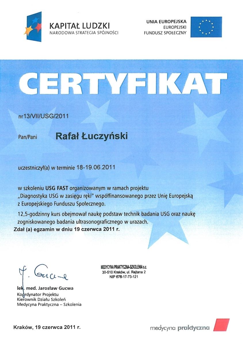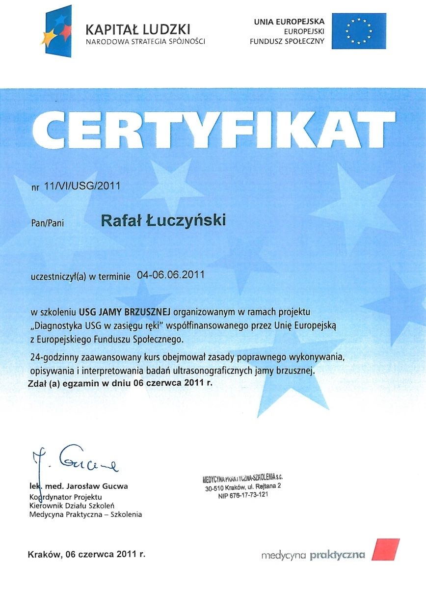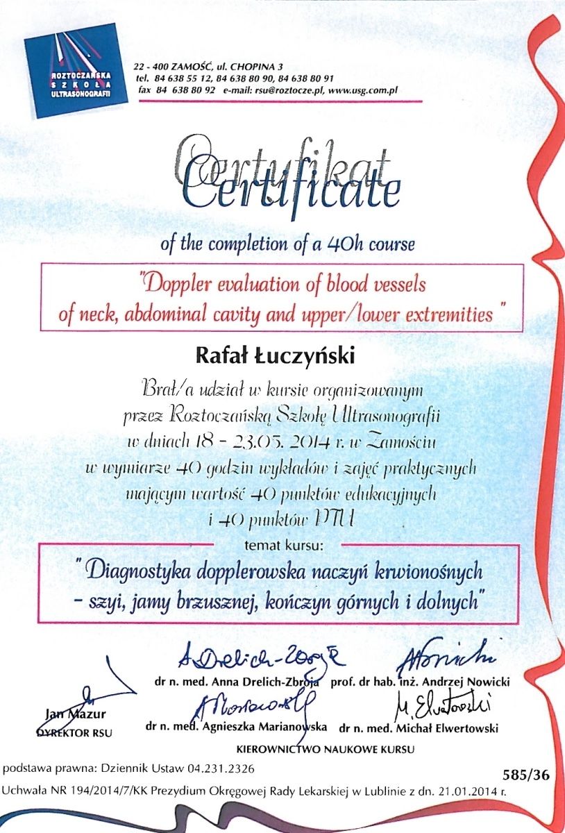 Certyfikowany diagnosta USG Polskiego Towarzystwa Ultrasonograficznego.