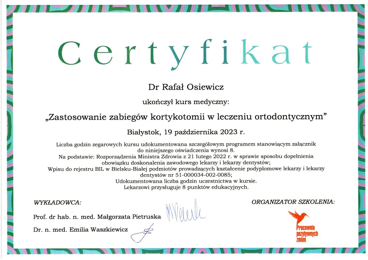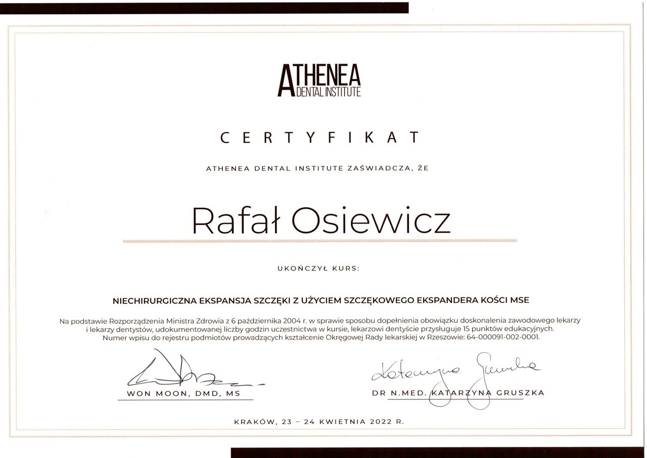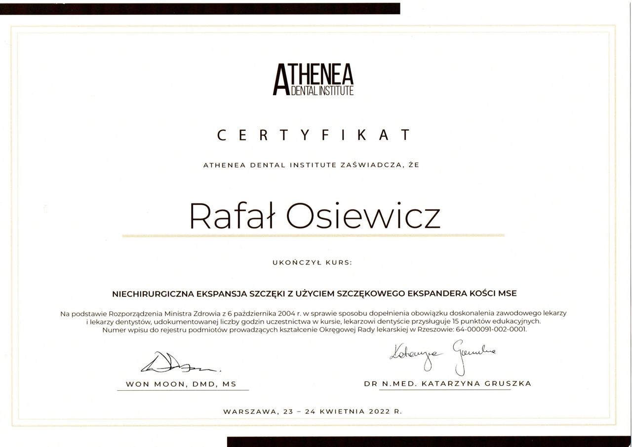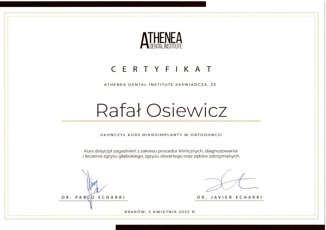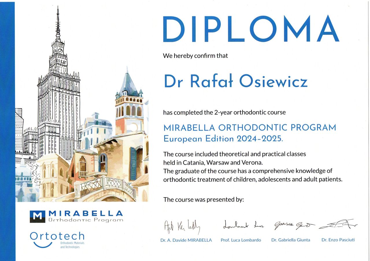 Jestem bardzo zadowolony z efektów po 1,5 roku noszenia aparatu pod okiem pana dra Osiewicza. Pan doktor to bardzo ciepła, serdeczna osoba i w takiej atmosferze przebiegały wszystkie wizyty. Zawsze jasno wiedziałem jak dbać o aparat w domu i poprawnie zakładać wyciągi, co dawało widoczne efekty. Z gabinetu wychodziłem zawsze na bieżąco poinformowany o postępach leczenia i tym, co jeszcze przede mną. Wizyty kontrolne trwały bardzo krótko i były zawsze na czas. Nie mogę napisać żadnego złego słowa o Panu Doktorze Rafale Osiewiczu.