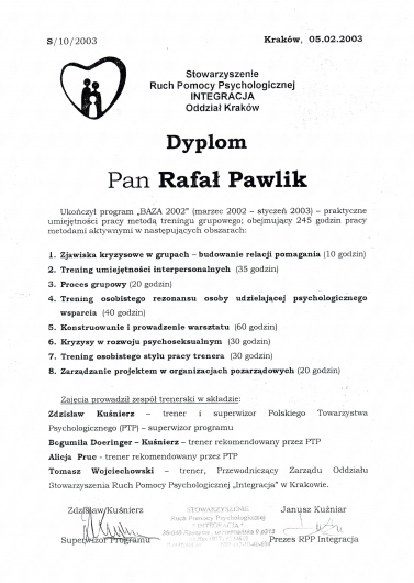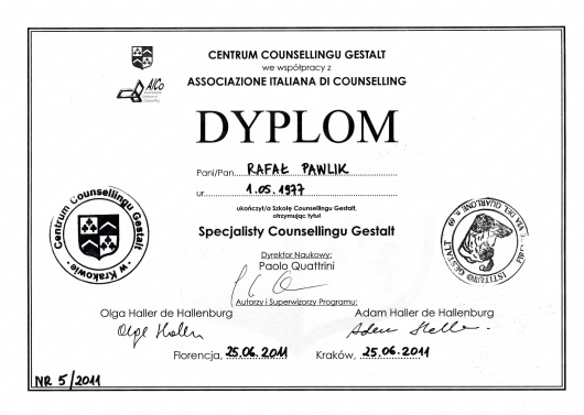 Jestem absolwentem Instytutu Psychologii UJ. Ukończyłem trzyletnią Szkołę Counsellingu Gestalt w Centrum Counsellingu Gestalt w Krakowie. Jestem członkiem Polskiego Towarzystwa Psychologicznego. Prowadzę badania naukowe w ramach studiów doktoranckich w Instytucie Psychologii UJ, współpracuję jako wykładowca z Instytutem Psychologii, Instytutem Psychologii Stosowanej UJ oraz Centrum Alternatywnego Rozwiązywania Sporów UJ.