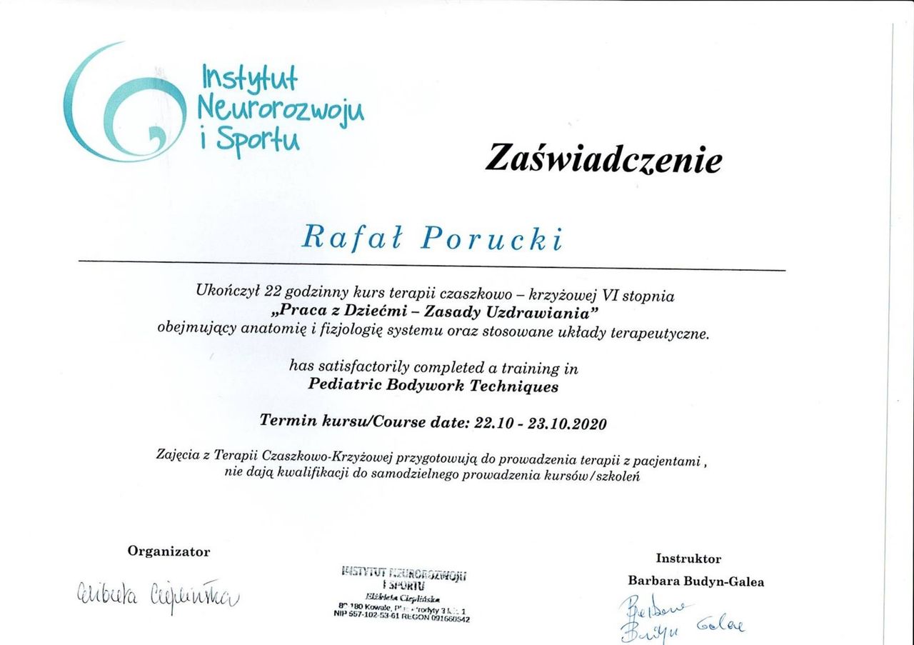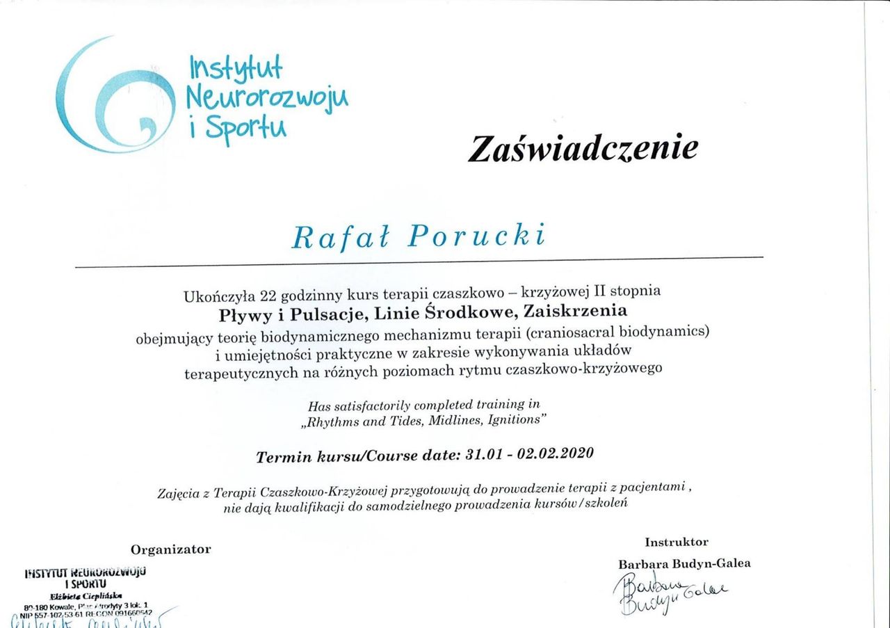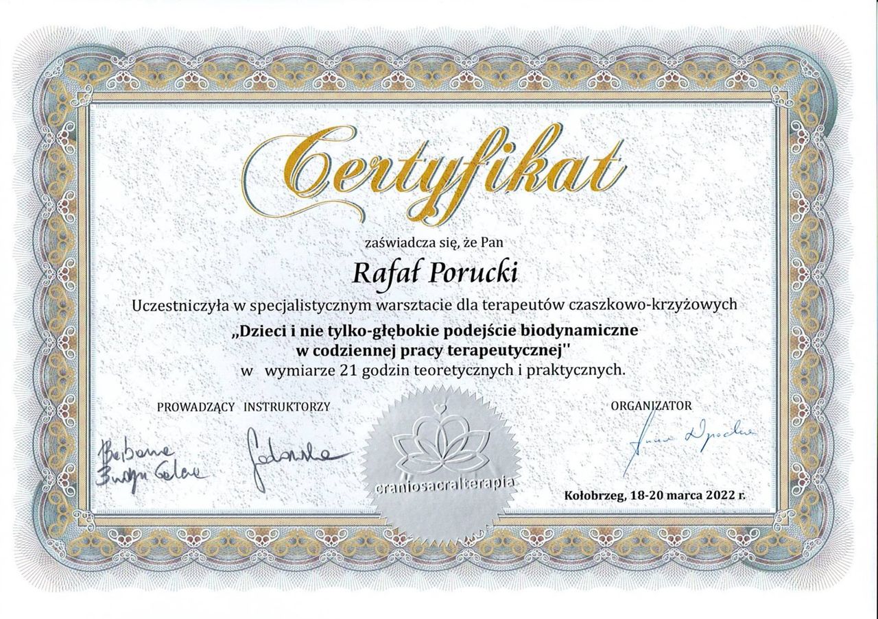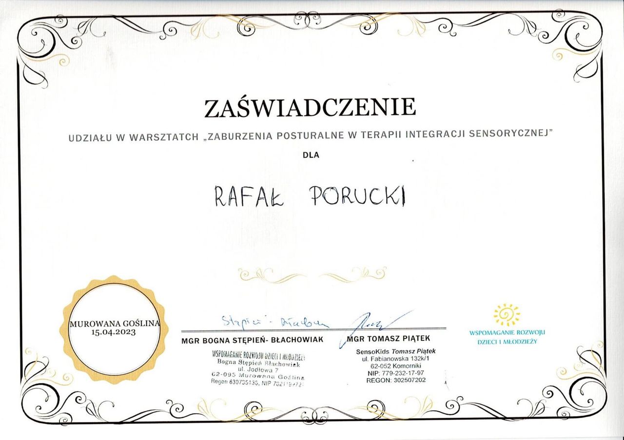 Jaki jest zakres porad oferowanych przez Rafał Porucki?Rafał Porucki to fizjoterapeuta. Na podstawie swojego doświadczenia i wykształcenia Rafał Porucki oferuje usługi takie jak: integracja sensoryczna, Terapia czaszkowo-krzyżowa, Diagnoza zaburzeń integracji sensorycznej z opinią, Fizjoterapia dzieci (kolejna wizyta), Fizjoterapia stawów skroniowo-żuchwowych, konsultacja fizjoterapeutyczna dzieci.