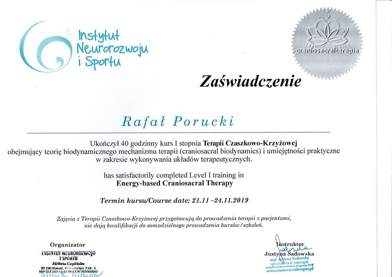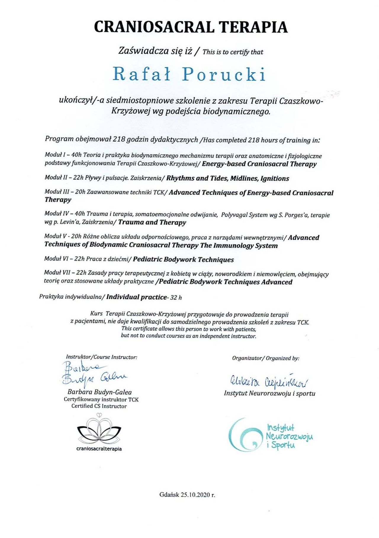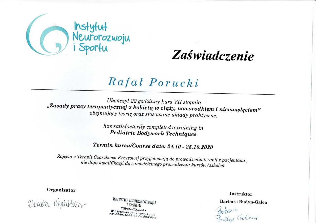 Jaki jest zakres porad oferowanych przez Rafał Porucki?Rafał Porucki to fizjoterapeuta. Na podstawie swojego doświadczenia i wykształcenia Rafał Porucki oferuje usługi takie jak: integracja sensoryczna, Terapia czaszkowo-krzyżowa, Diagnoza zaburzeń integracji sensorycznej z opinią, Fizjoterapia dzieci (kolejna wizyta), Fizjoterapia stawów skroniowo-żuchwowych, konsultacja fizjoterapeutyczna dzieci.