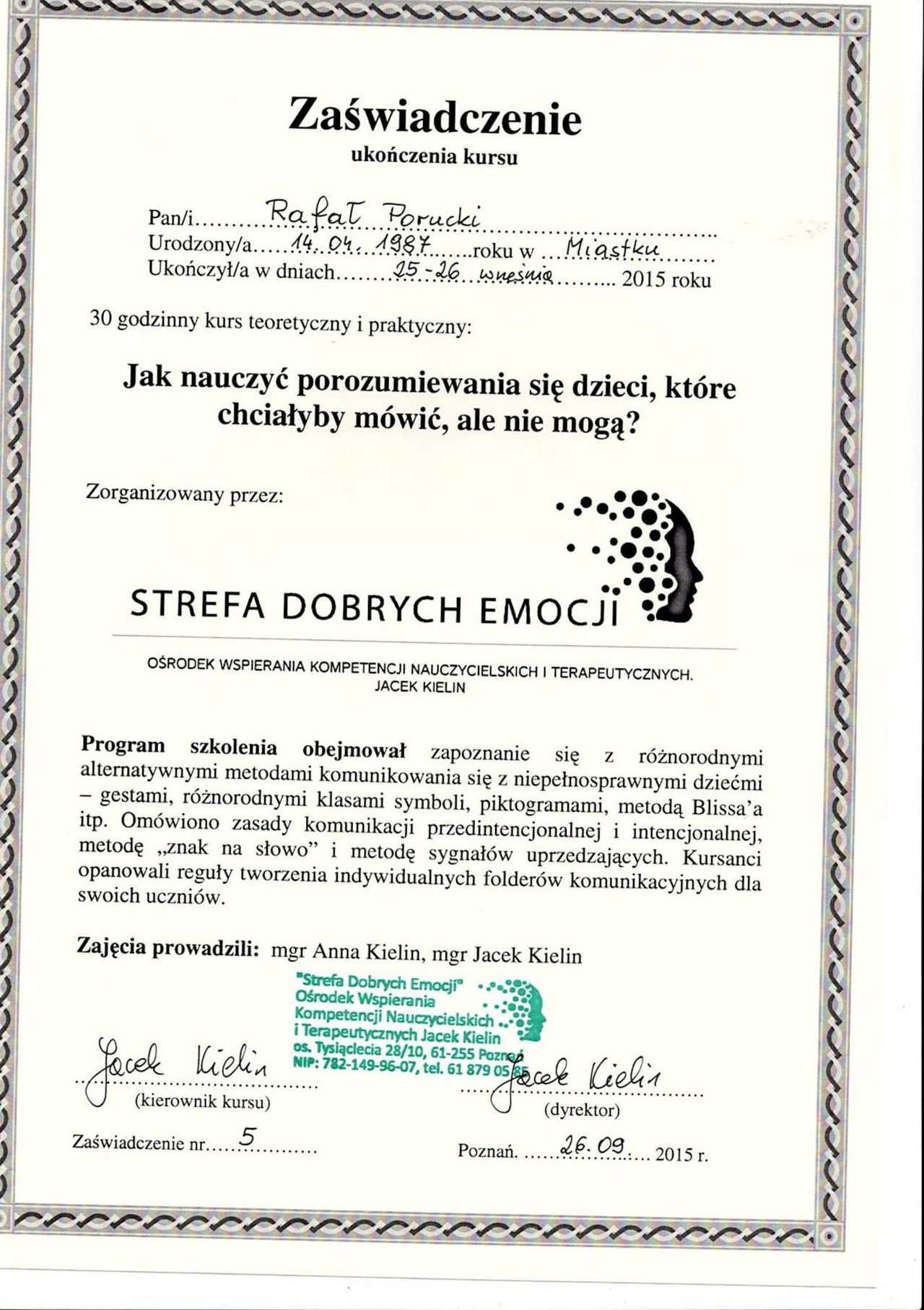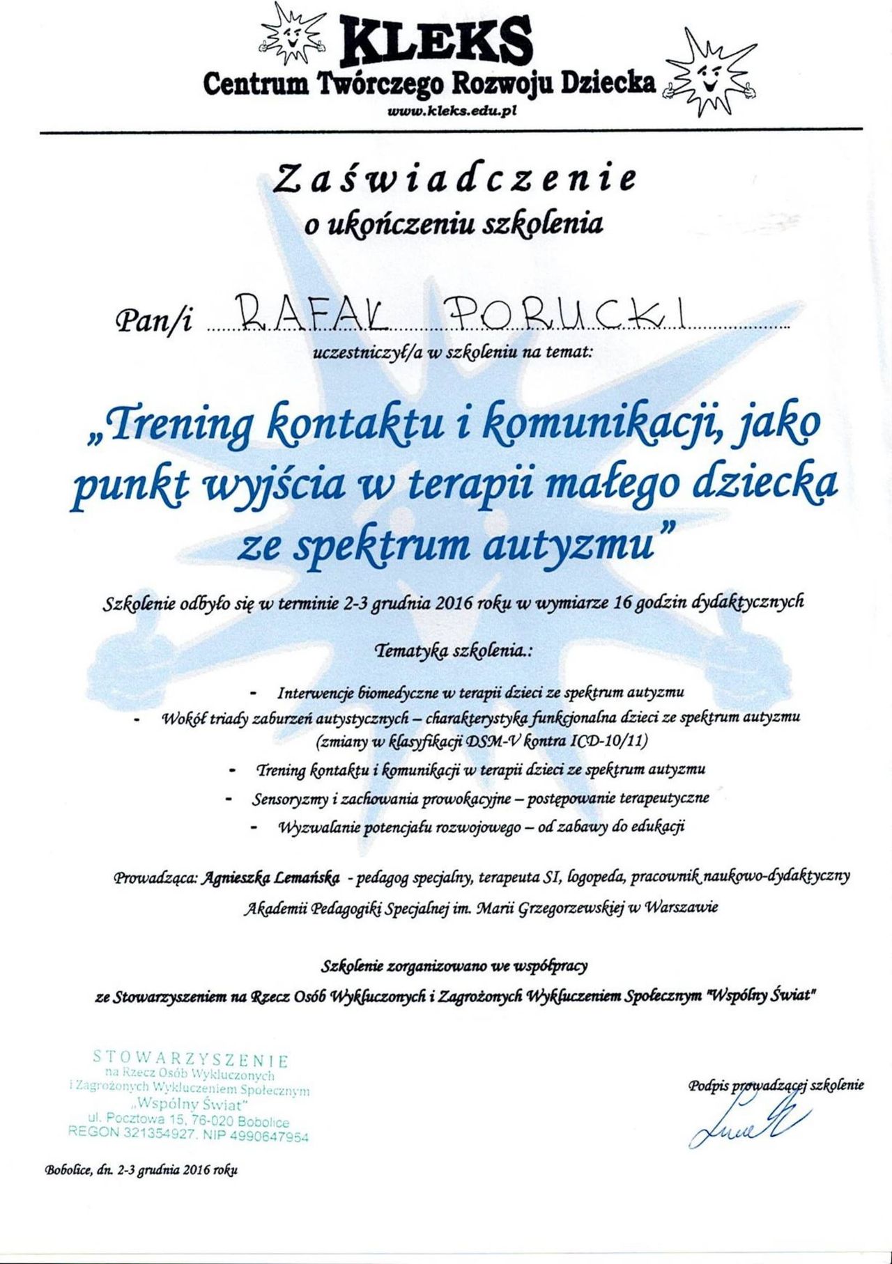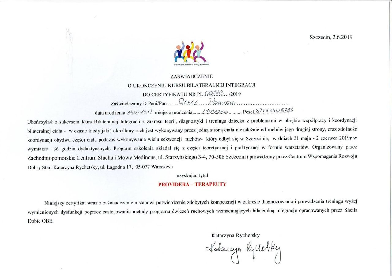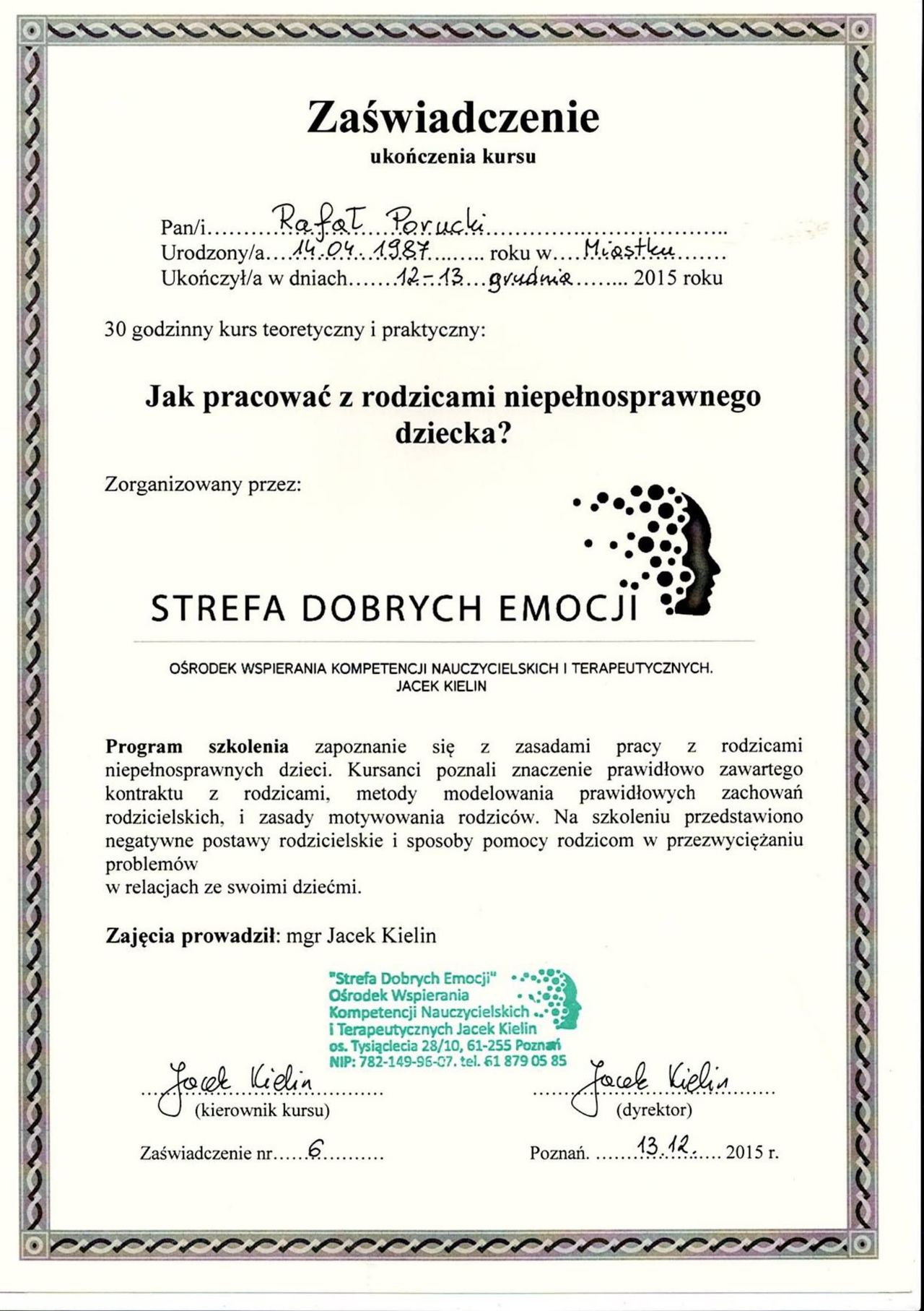 Jesteśmy na etapie pierwszych spotkań jednak Pan Rafał już dał się poznać jako osoba bardzo zaangażowana w pracę z dzieckiem. Bardzo dużo opowiada na temat pracy z maluchem,jak można w domu kontynuować pracę żeby był efekt całokształtu. Super kontakt z dzieckiem co jest na duży plus , rzetelność 100%, zainteresowanie swoim podopiecznym nie kończy się wraz z wyjściem z gabinetu bo Pan Rafał dopytuje się o postępy,zmiany jakie zaszły kiedy się nie widzimy. Podsumowując bardzo serdecznie polecamy współpracę z Panem Rafałem