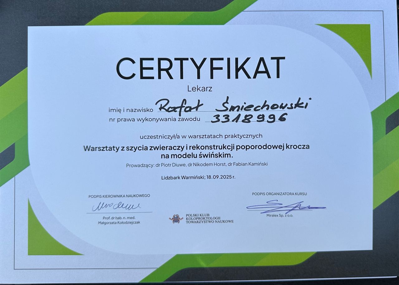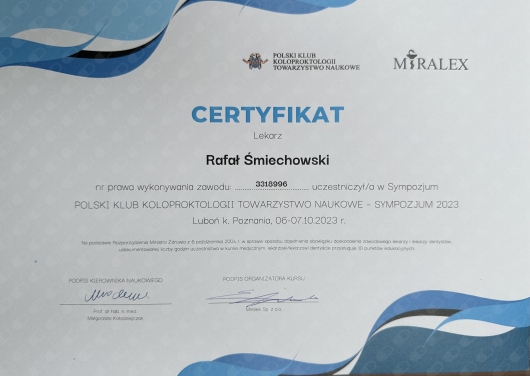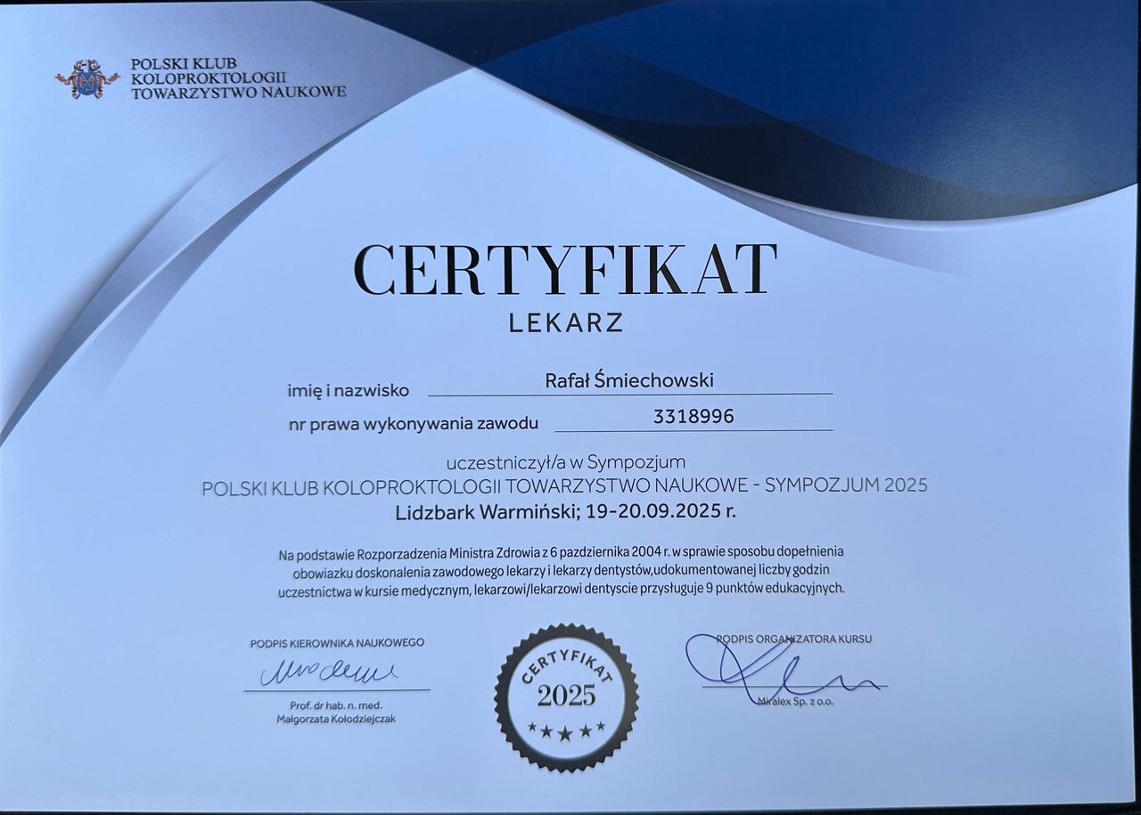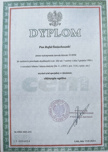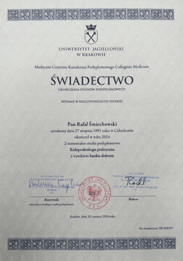 Jestem absolwentem kierunku lekarskiego na Gdańskim Uniwersytecie Medycznym, gdzie zdobyłem solidne podstawy teoretyczne oraz praktyczne w dziedzinie medycyny. Swoje szkolenie specjalizacyjne w obszarze chirurgii ogólnej odbywałem w Uniwersyteckim Centrum Klinicznym w Gdańsku oraz w Powiatowym Centrum Zdrowia w Kartuzach, co pozwoliło mi na rozwój umiejętności w różnorodnych aspektach chirurgii. Tytuł specjalisty chirurgii ogólnej uzyskałem w 2024 roku, co stanowi dla mnie znaczący krok w mojej karierze zawodowej. Aby dalej rozwijać swoje umiejętności, w roku akademickim 2023/2024 ukończyłem studia podyplomowe z zakresu Koloproktologii praktycznej. W swojej codziennej praktyce koncentruję się na leczeniu chorób proktologicznych, zarówno w sposób zachowawczy, jak i operacyjny, a także stosuję techniki małoinwazyjne, takie jak skleroterapia, zabieg Barrona oraz laseroterapia. Uważam, że ciągłe kształcenie jest kluczowe w naszym zawodzie, dlatego regularnie uczestniczę w konferencjach i szkoleniach, aby być na bieżąco z nowinkami medycznymi. W mojej codziennej pracy stawiam na komfort pacjenta oraz przejrzystość zaleceń, co pozwala na osiągnięcie jak najlepszych rezultatów leczenia. Wierzę, że komunikacja z pacjentem oraz zrozumienie jego potrzeb są niezwykle istotne w procesie terapeutycznym.