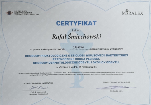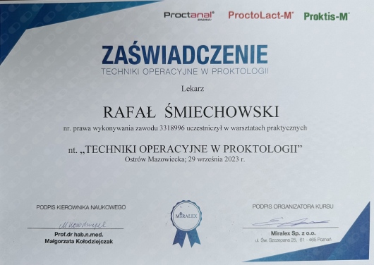 Jaki jest zakres porad oferowanych przez Rafał Śmiechowski?Rafał Śmiechowski to proktolog, chirurg. Na podstawie swojego doświadczenia i wykształcenia Rafał Śmiechowski oferuje usługi takie jak: konsultacja proktologiczna, Konsultacja chirurgiczna, Rektoskopia, Operacja skóry radykalne wycięcie zmiany do 1.5 cm, operacja skóry radykalne wycięcie zmiany powyżej 1.5 cm, Toksyna botulinowa 1 okolica, Zabieg proktologiczny - gumkowanie/ podwiązanie/ ligacja żylaków odbytu, skleroterapia hemoroidów, Leczenie szczeliny odbytu toksyną botulinową.