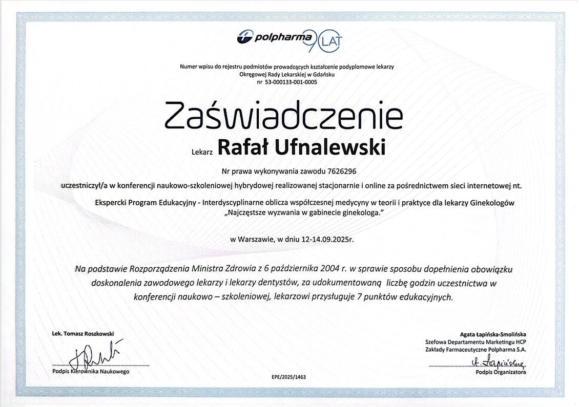 Jaki jest zakres porad oferowanych przez Rafał Ufnalewski?Rafał Ufnalewski to ginekolog. Na podstawie swojego doświadczenia i wykształcenia Rafał Ufnalewski oferuje usługi takie jak: Antykoncepcja, badania profilaktyczne, cytologia, diagnostyka niepłodności, histeroskopia, konsultacja ginekologiczna, konsultacja online, prowadzenie ciąży, USG ginekologiczne, USG piersi.