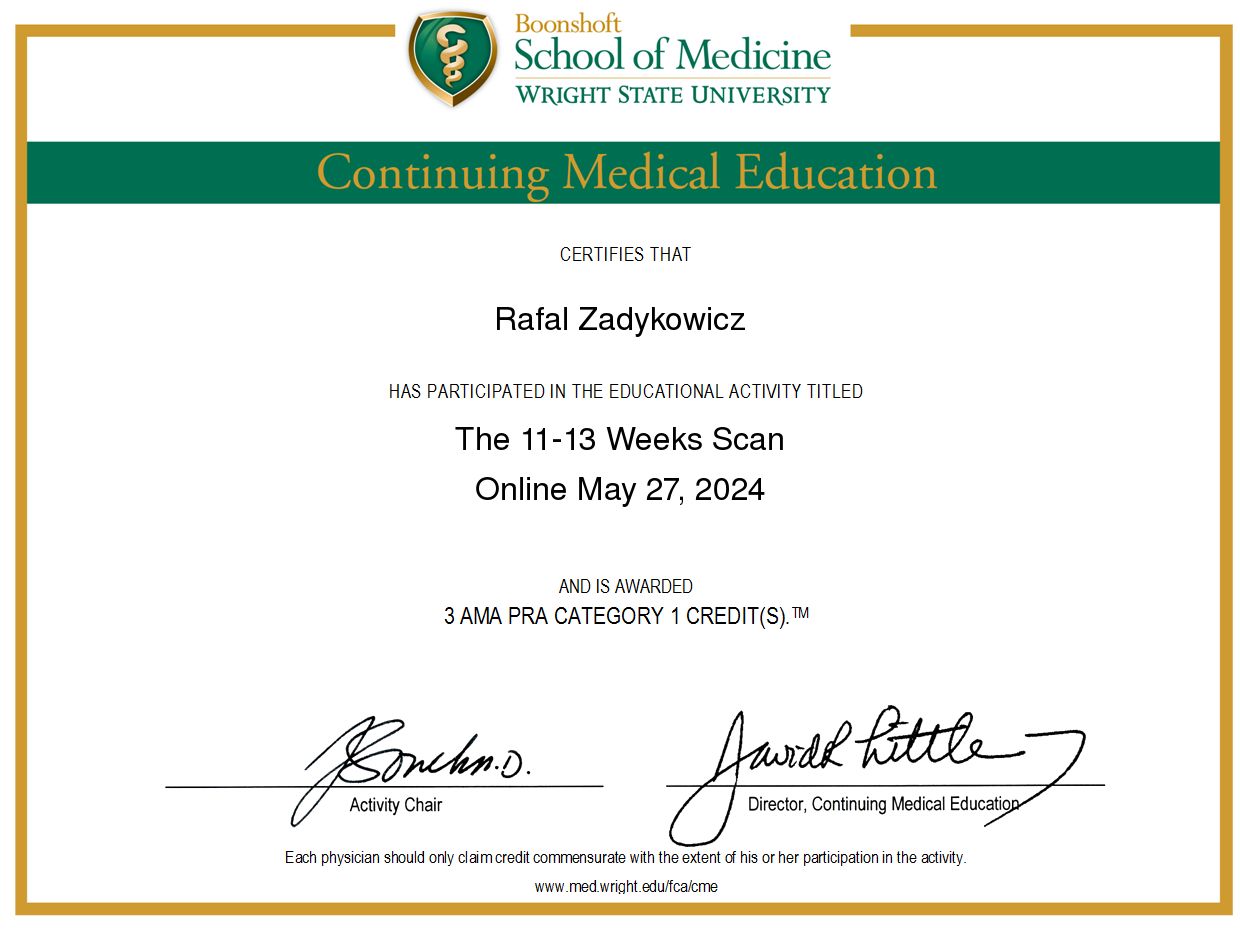 - Certyfikat FMF (Fetal Medicine Foundation) pozwalający na wykonywanie badań prenatalnych I trymestru z wyliczeniem ryzyka wad genetycznych - nr 209409,