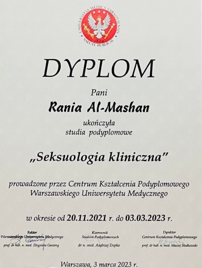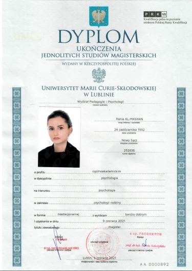 Byłam u wielu psychologów, ale Pani Rania Al-Mashan jest wyjątkowa. Po wizycie czułam się jakbym zrzuciła z siebie balast. Dowiedziałam się w ciągu jednej wizyty więcej o sobie niż w ciągu ostatnich lat terapii. Czuję, że po rozmowie z Panią psycholog jestem w innym, lepszym miejscu. Jestem bardzo wdzięczna za tę rozmowę.