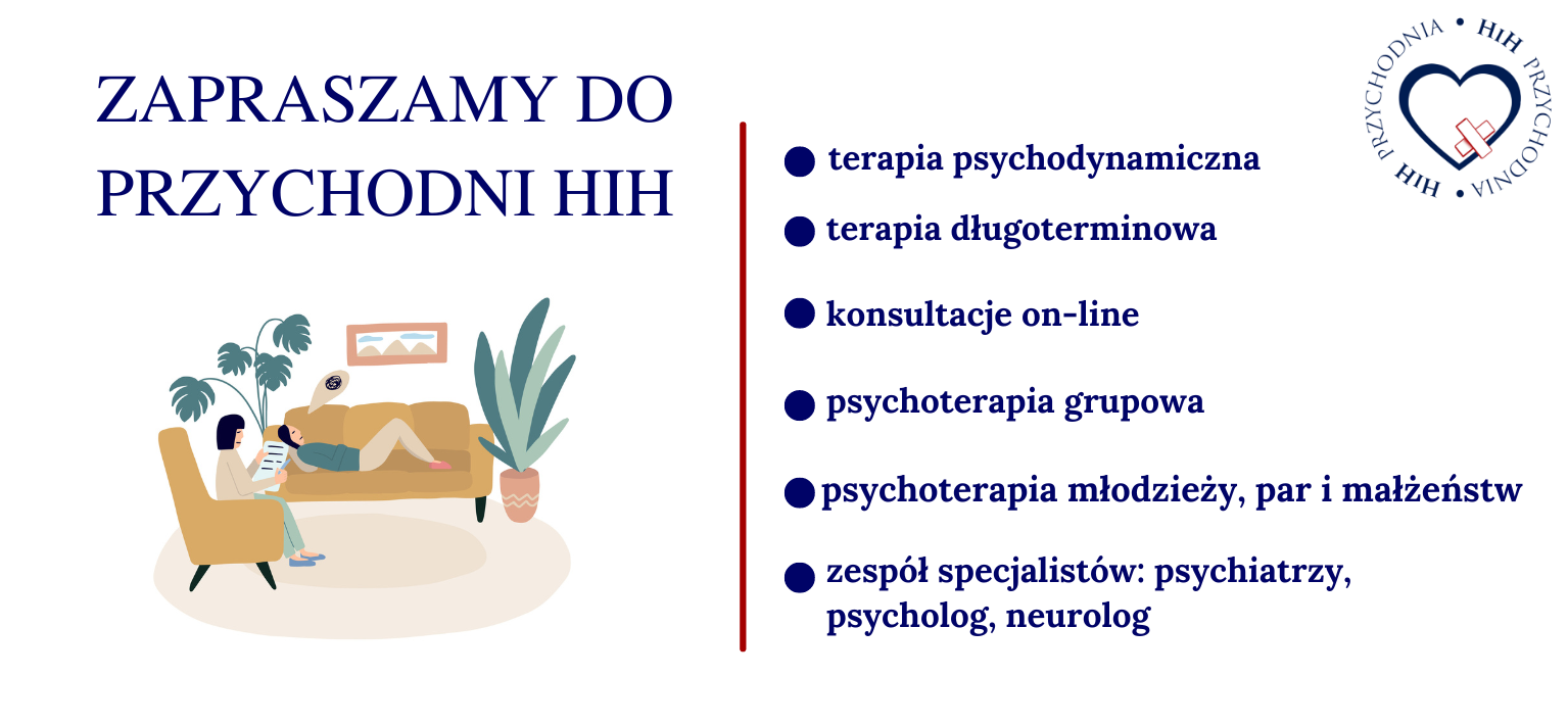 Serdecznie zapraszamy do Przychodni HiH na psychoterapię prowadzoną przez wybitnych specjalistów, w miłej atmosferze nowoczesnej placówki, gdzie dbałość o samopoczucie Pacjenta jest naszym najwyższym priorytetem.