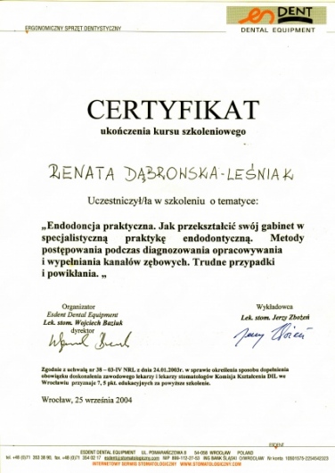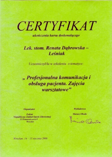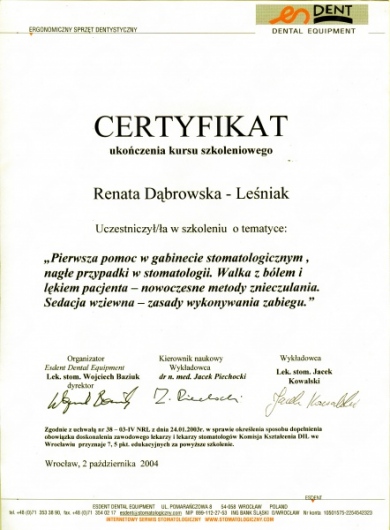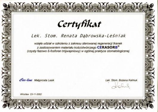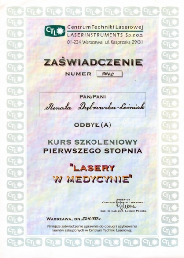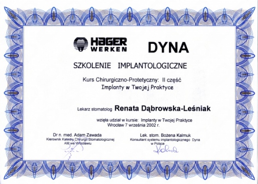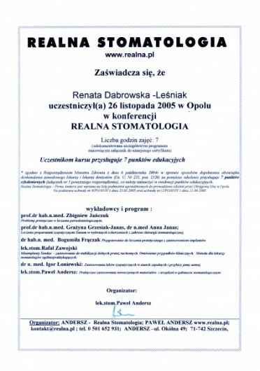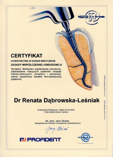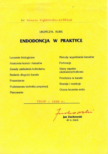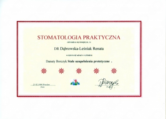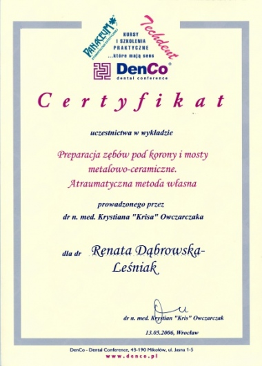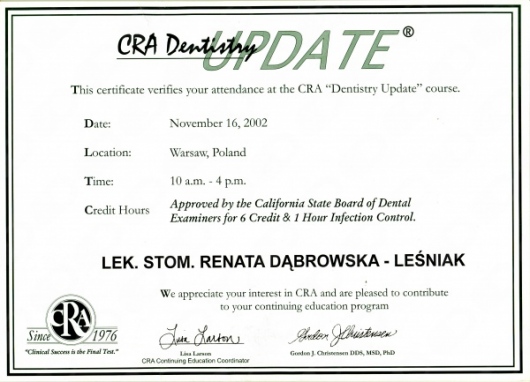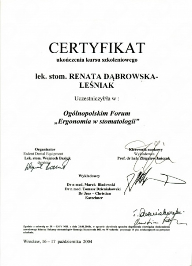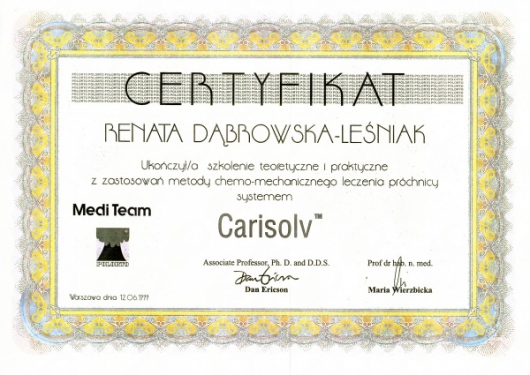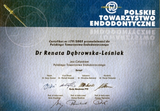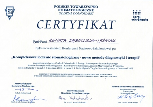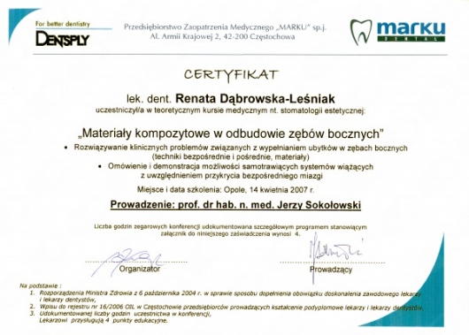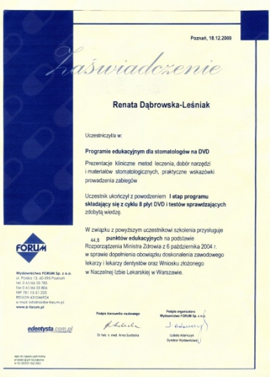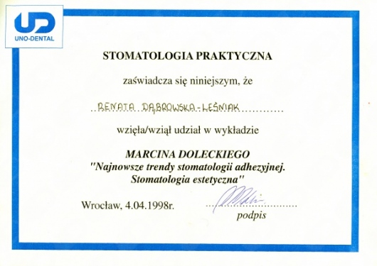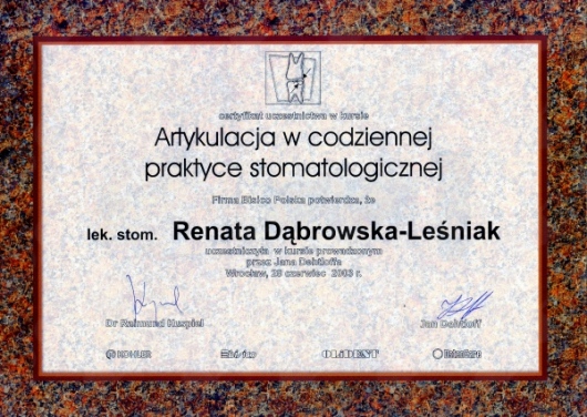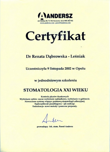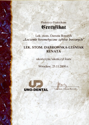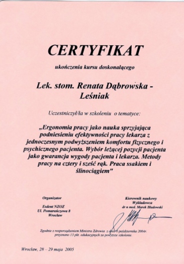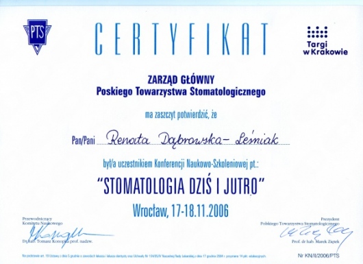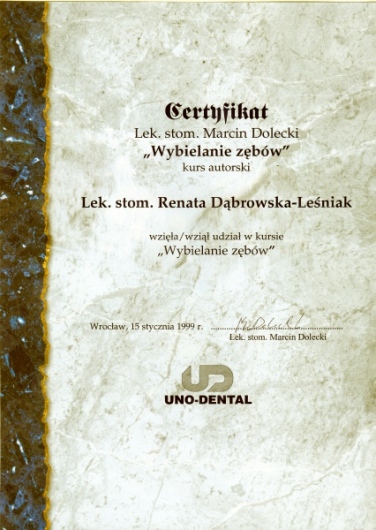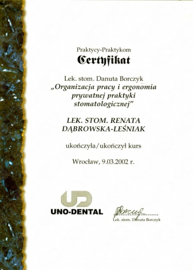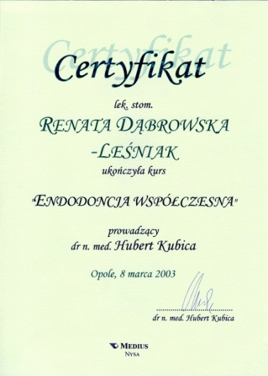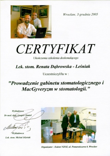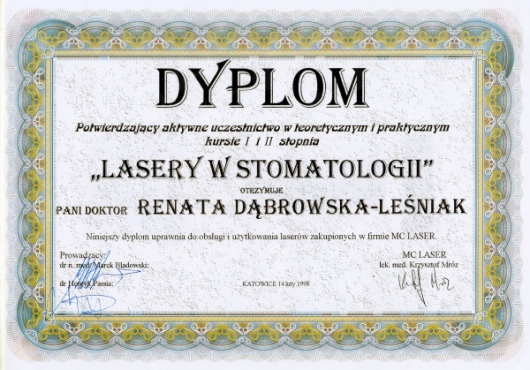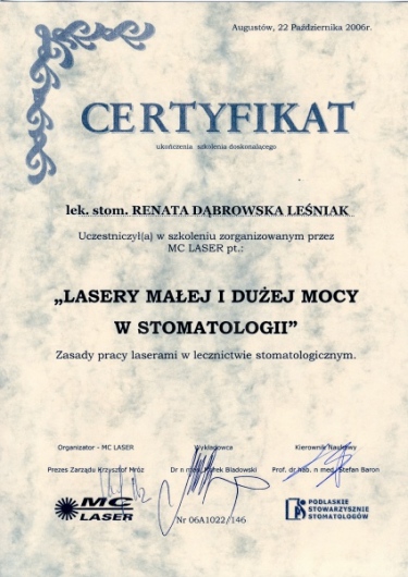 Lek. dent. Renata Dąbrowska-Leśniak ukończyła Akademię Medyczną we Wrocławiu, by po kilku latach pracy zawodowej otworzyć swój pierwszy gabinet stomatologiczny. Od początku istnienia firmy stawiała na innowacyjność, szkolenia i silnie rozwijającą się technologię laserów.