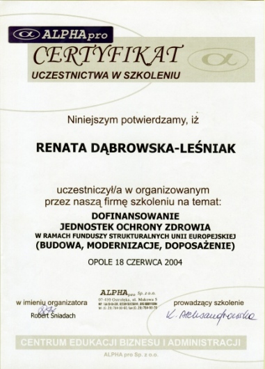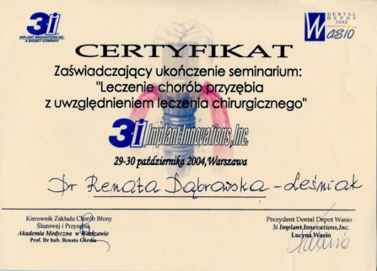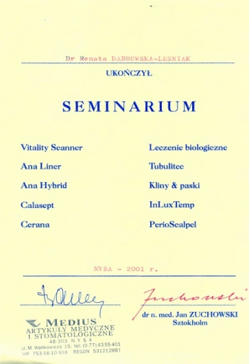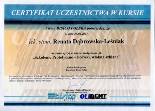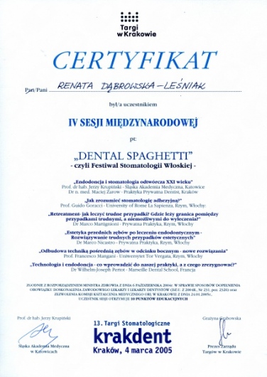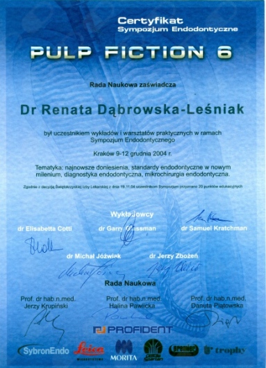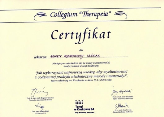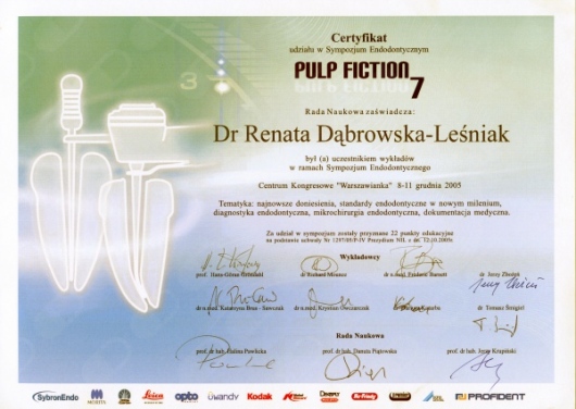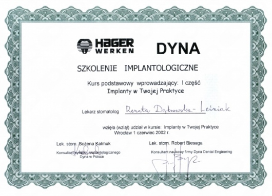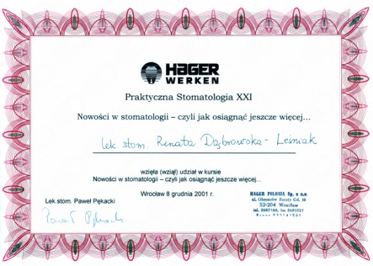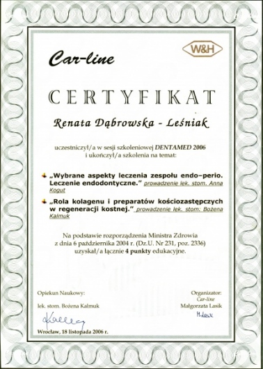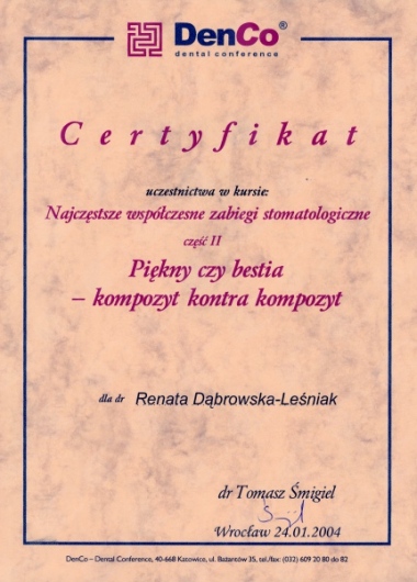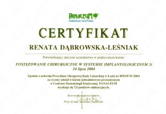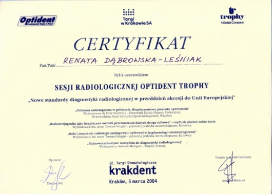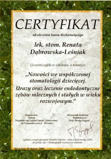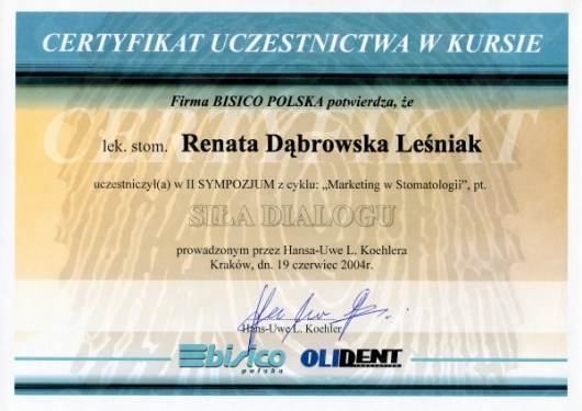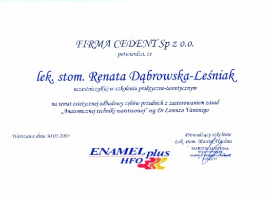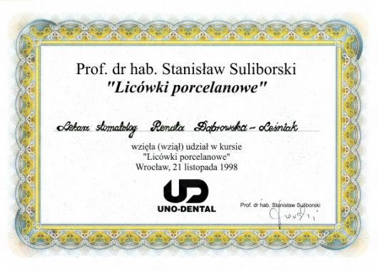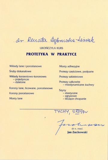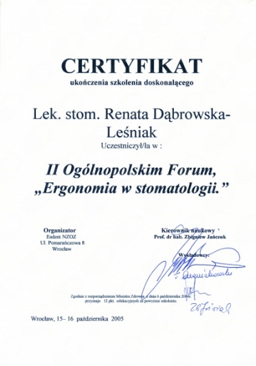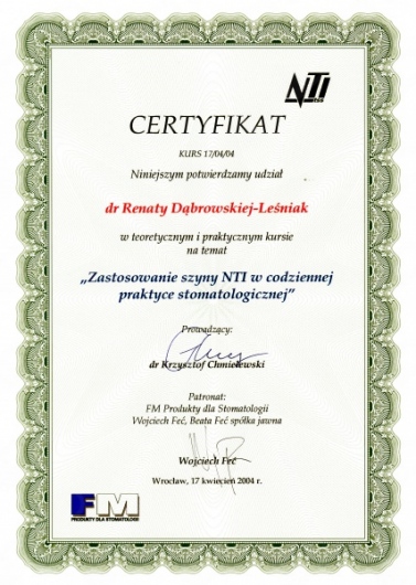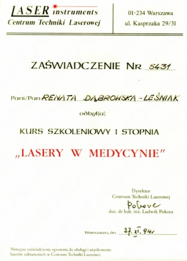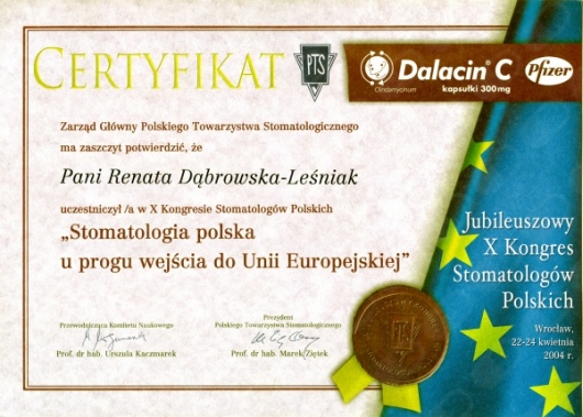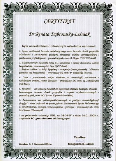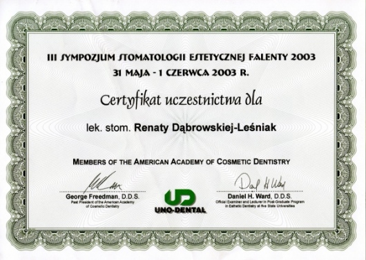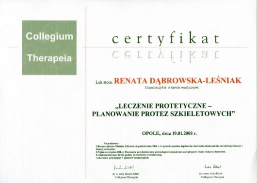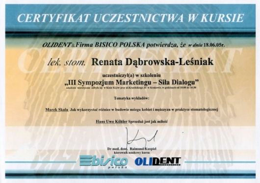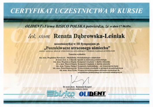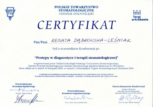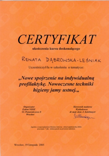 Lek. dent. Renata Dąbrowska-Leśniak ukończyła Akademię Medyczną we Wrocławiu, by po kilku latach pracy zawodowej otworzyć swój pierwszy gabinet stomatologiczny. Od początku istnienia firmy stawiała na innowacyjność, szkolenia i silnie rozwijającą się technologię laserów.