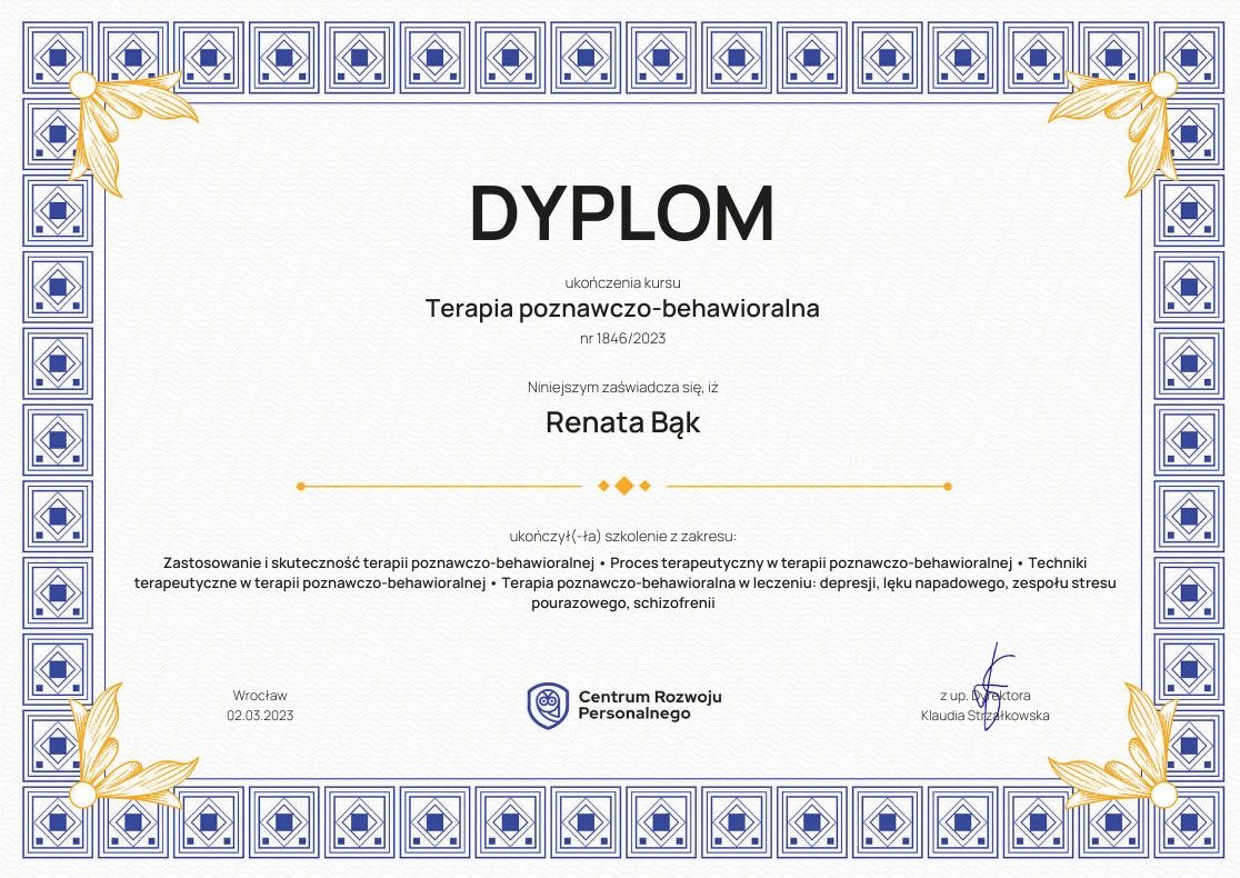 Psychoterapię prowadzę w nurcie poznawczo-behawioralnym, który jest jedną z najbardziej popularnych i skutecznych metod terapii. Terapia ta opiera się na założeniu, że nasze myśli, emocje i zachowania są ze sobą powiązane. Poprzez identyfikację negatywnych schematów myślowych i automatycznych przekonań, pracujemy nad zmianą sposobu myślenia, co z kolei wpływa na poprawę samopoczucia i funkcjonowania w codziennym życiu.