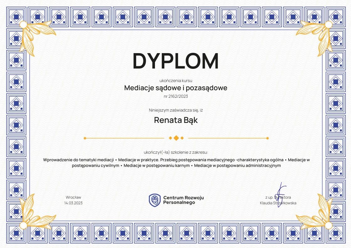 Jaki jest zakres porad oferowanych przez Renata Michalska?Renata Michalska to psychoterapeuta. Na podstawie swojego doświadczenia i wykształcenia Renata Michalska oferuje usługi takie jak: konsultacja psychoterapeutyczna, psychoedukacja, konsultacja psychoterapeutyczna (pierwsza wizyta), relaksacja, psychoterapia partnerska, konsultacja terapeutyczna, warsztaty psychologiczne, interwencja kryzysowa, psychoterapia uzależnień, poradnictwo dla rodziców.