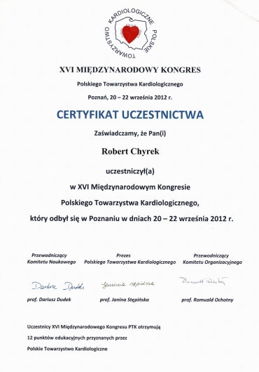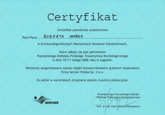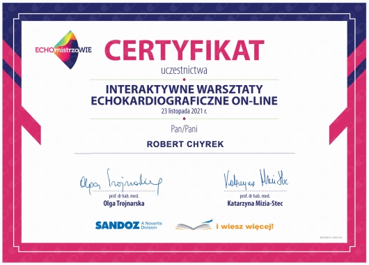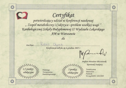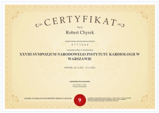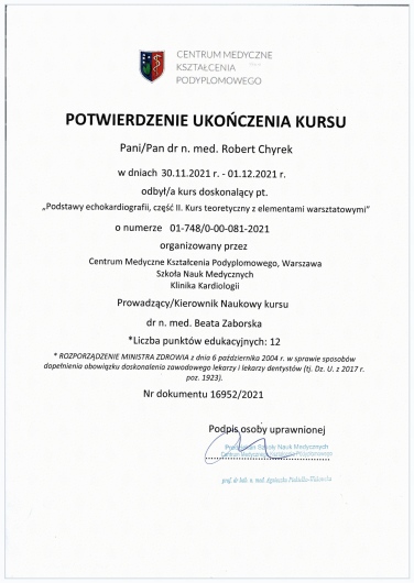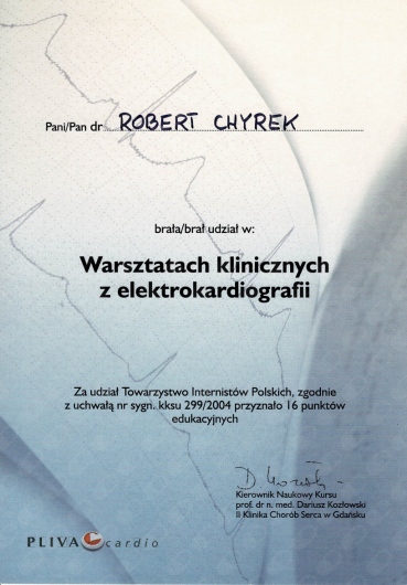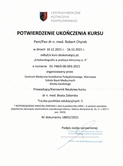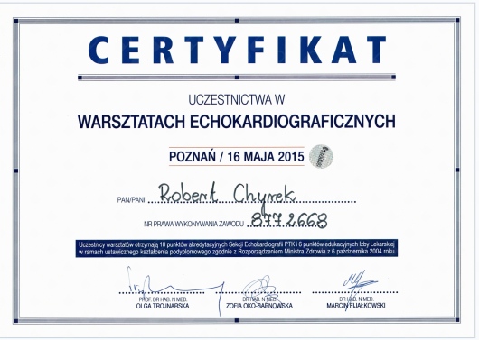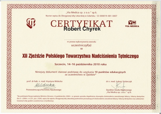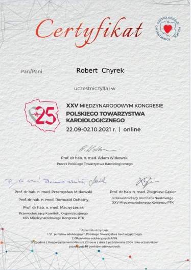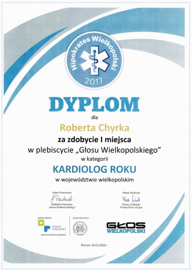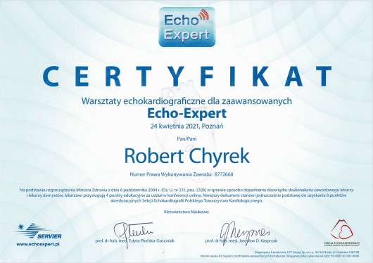 Kompetencja, obszerna wiedza medyczna (holistyczne podejście do zdrowia pacjenta), życzliwość ii cierpliwość w stosunku do pacjenta! Doktor Robert Chyra wszystko mi wytłumaczył i mnie z uwagą wysłuchał. Polecam z całego serca, tym bardziej, że to również kardiolog a ja byłam u Pana Doktora z powodu problemów z sercem.