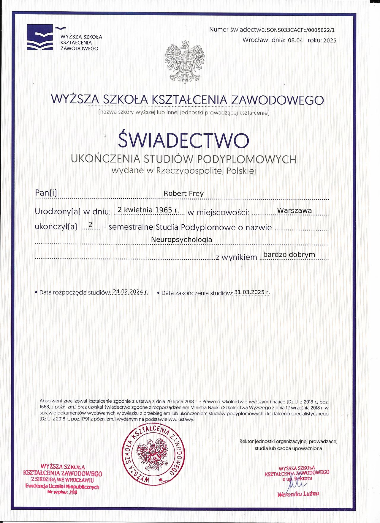 Jaki jest zakres porad oferowanych przez Robert Frey?Robert Frey to psycholog. Na podstawie swojego doświadczenia i wykształcenia Robert Frey oferuje usługi takie jak: konsultacja psychoterapeutyczna, Psychoterapia dzieci i młodzieży, Psychoterapia indywidualna dorosłych, Psychoterapia - alkoholizm, narkotyki, dopalacze, psychoterapia małżeńska, Psychoterapia uzależnień i współuzależnienia, Sesja psychoterapeutyczna, Terapia systemowa rodzin, terapia uzależnień, Arteterapia.