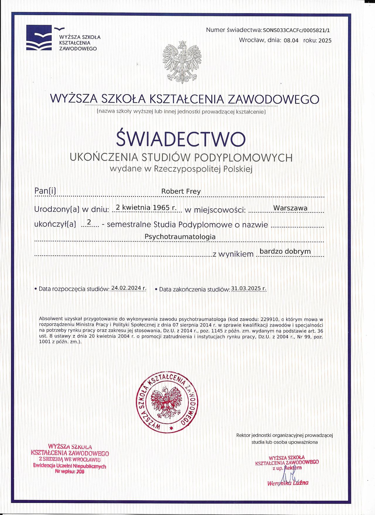 Pan Robert Fray to wyjątkowy psychoterapeuta — pełen empatii, spokoju i profesjonalizmu. Od pierwszej sesji stworzył atmosferę zaufania, która pozwoliła mi otworzyć się i spojrzeć na siebie z nowej perspektywy. Dzięki jego wsparciu odzyskuję równowagę i wewnętrzną siłę. Z całego serca polecam terapię u pana Roberta każdemu, kto szuka prawdziwego zrozumienia.