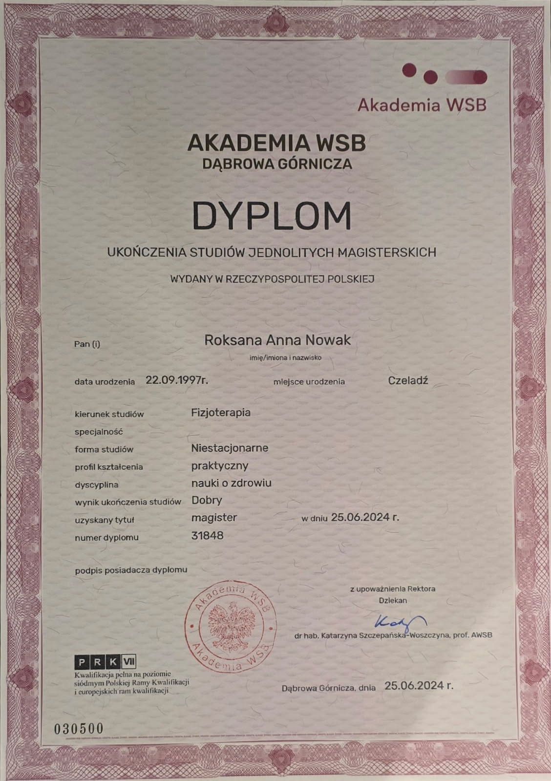 Jestem magistrem fizjoterapii od 2024 roku, studia ukończyłam Akademii WSB w Dąbrowie Górniczej. Od ponad roku pracuję jako fizjoterapeutka.