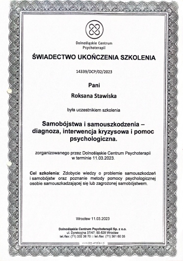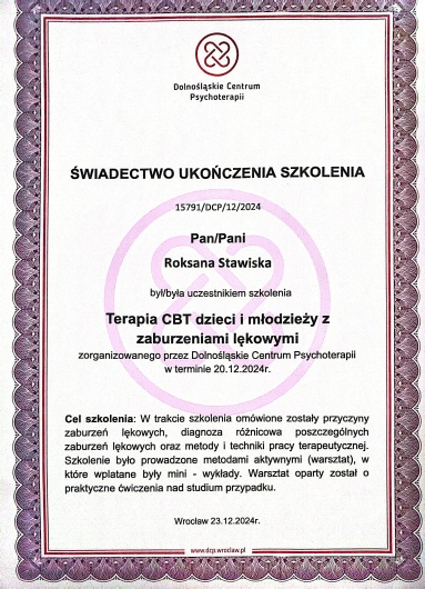 Pani psycholog pomogła zarówno mnie jak i moje córce. Czułyśmy się wysłuchane, zaopiekowane i krok po kroku pani Roksana wskazywała konkretne rozwiązania. Dziękujemy z całego serca za wsparcie i ciepło, które od Pani płynęło a także wiedzę i odpowiednie podejście do córki. Poczułyśmy ulgę po wizycie i wiemy już co robić dalej.