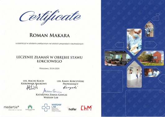 - Szkolenie Specjalizacyjne w dziedzinie Ortopedii i Traumatologii Narządu Ruchu w Oddziale Ortopedyczno-Urazowym Szpitala Powiatowego w Limanowej