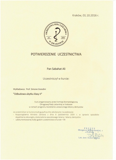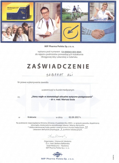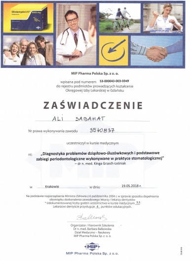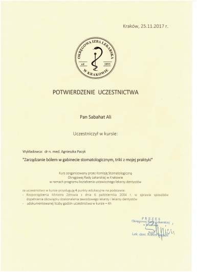 Jaki jest zakres porad oferowanych przez Sabahat Ali?Sabahat Ali to stomatolog, chirurg stomatologiczny, protetyk stomatologiczny. Na podstawie swojego doświadczenia i wykształcenia Sabahat Ali oferuje usługi takie jak: scaling, piaskowanie, pakiet higienizacyjny, wybielanie gabinetowe, wypełnienie estetyczne, licówka kompozytowa, wizyty adaptacyjne dla dzieci, usunięcie zęba jednokorzeniowego mlecznego, usunięcie zęba wielokorzeniowego mlecznego, wybielanie zęba martwego.