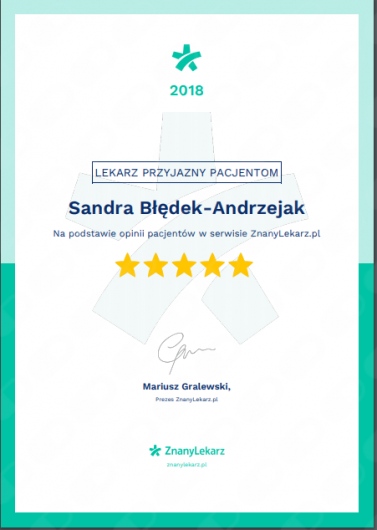 Pani doktor jak nikt inny ma holistyczne i mocno indywidualne podejście do pacjenta. Cechuję ją merytoryczne przygotowanie i mnóstwo empatii. Jeśli ktoś zastanawia się nad wyborem odpowiedniego lekarza, to wybór jest tylko jeden - dr. Sandra Błędek-Andrzejak