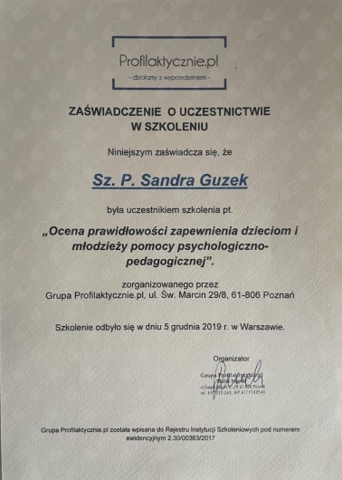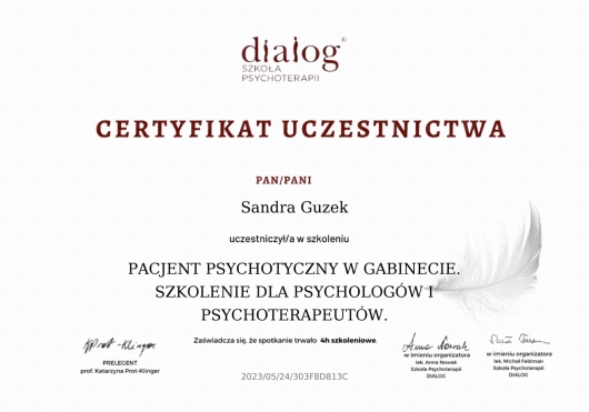 Cudownej, filigranowej Kobiety, zarażającej pozytywną energią. Ale przede wszystkim - osoby z ogromną wiedzą, doświadczeniem i chęcią pomocy. Jestem wdzięczna za każdą sekundę poświęconą mi przez p. Sandrę. Widzę, że nasze spotkania przynoszą efekty. Wiem, że terapia to nie dwa, trzy spotkania. Często jest to długa i wyboista droga ale dzięki takim terapeutkom - pełnym pasji, empatii i życzliwości - życie nas, pacjentów staje się łatwiejsze. Wszystkim tym, którzy potrzebują wsparcia, pomocy, tym których ogranicza strach, wstyd przed rozpoczęciem terapii, szczerze polecam p. Sandrę Guzek.• Poradnia Zdrowia Psychicznego Medi-Life Wilanów • Konsultacja psychologiczna •