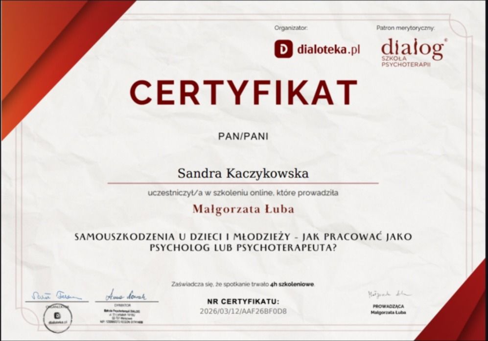 Pani Sandra to Anioł. Jest bardzo mądrą, ciepłą i dobrą osobą, a do tego także profesjonalistką w każdym calu. Jest niezwykle zaangażowania w to, co robi. Polecam każdemu terapię z Panią Sandrą.