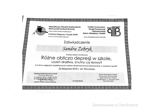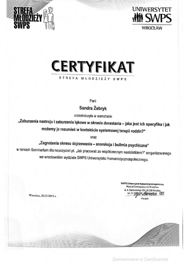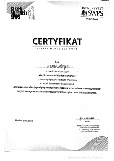 Ukończyłam kursy z zakresu edukacji psychodietetycznej, uzależnień behawioralnych, komunikacji bez przemocy, terapii poznawczo-behawioralnej (niebezpieczne zachowania młodzieży, zaburzenia emocjonalne oraz osobowościowe).