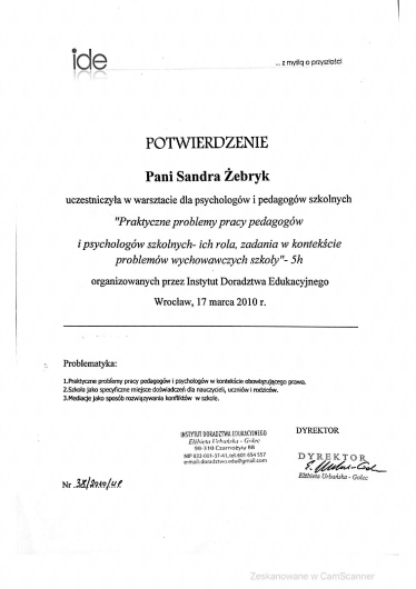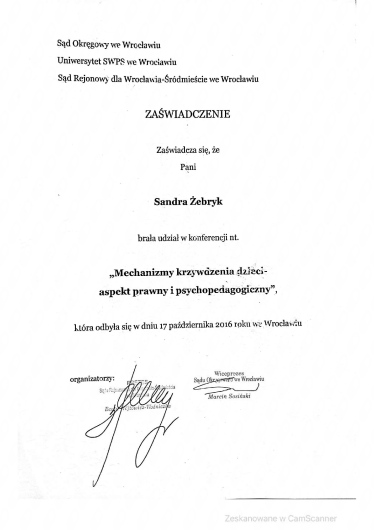 Nabyłam specjalistyczne umiejętności dotyczące postępowania mediacyjnego w sprawach nieletnich.