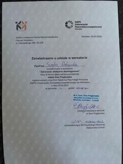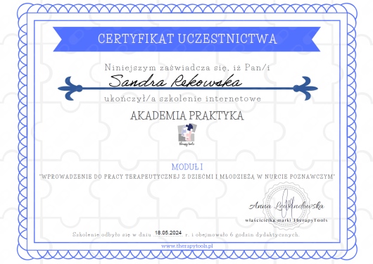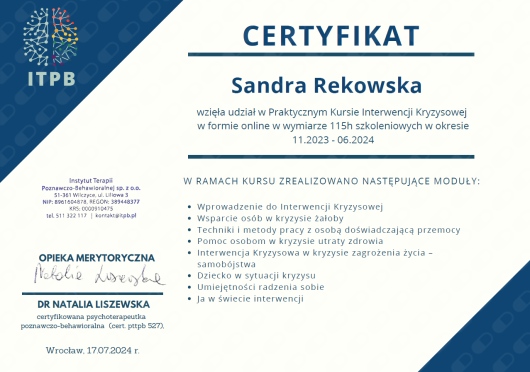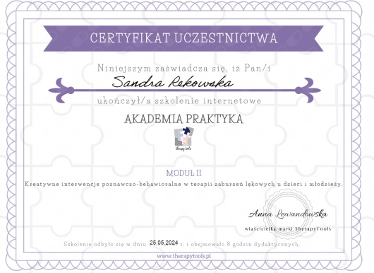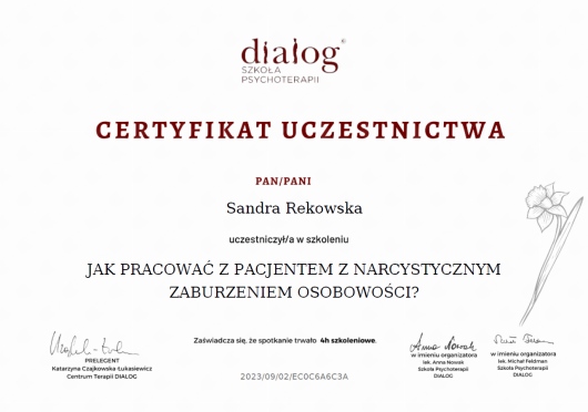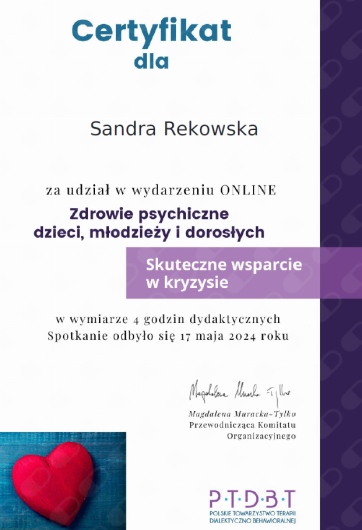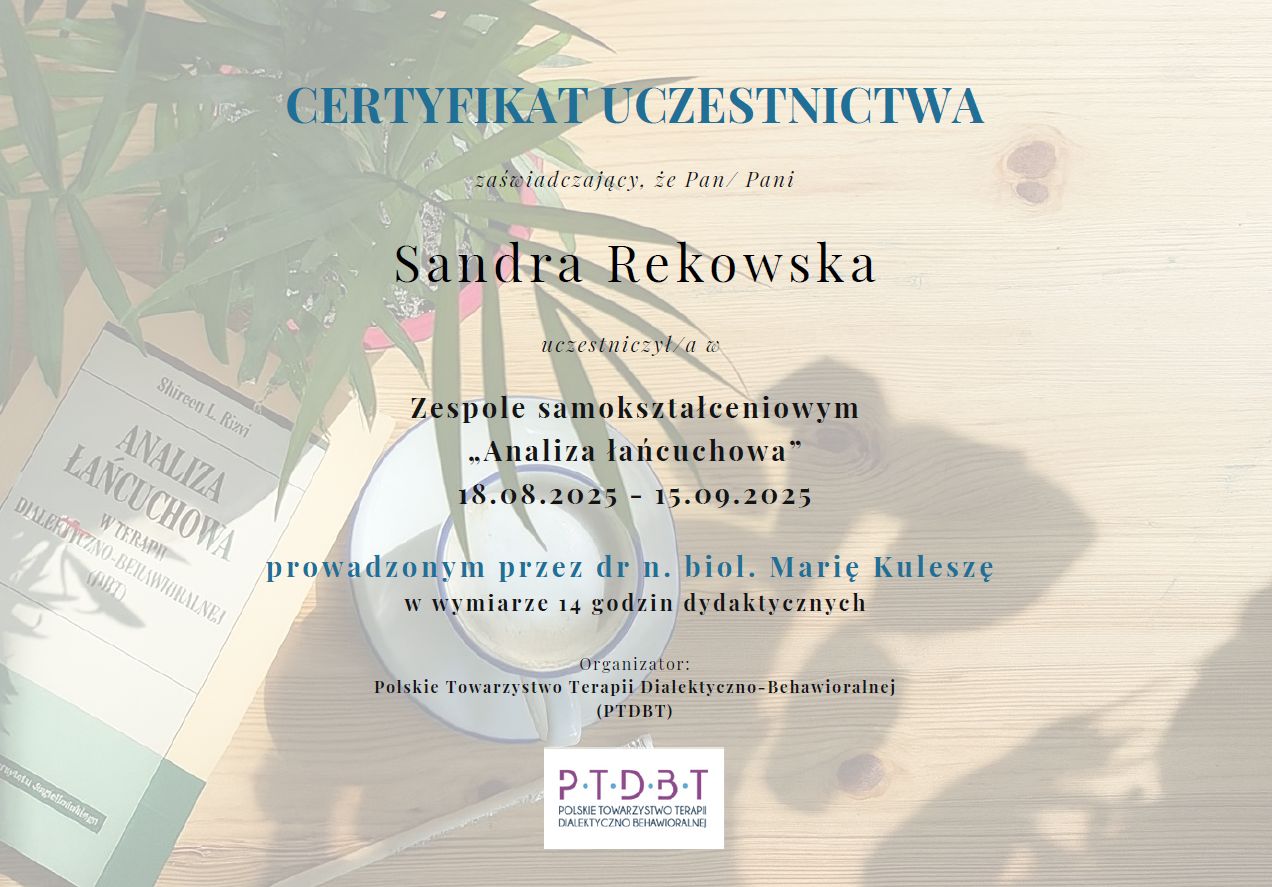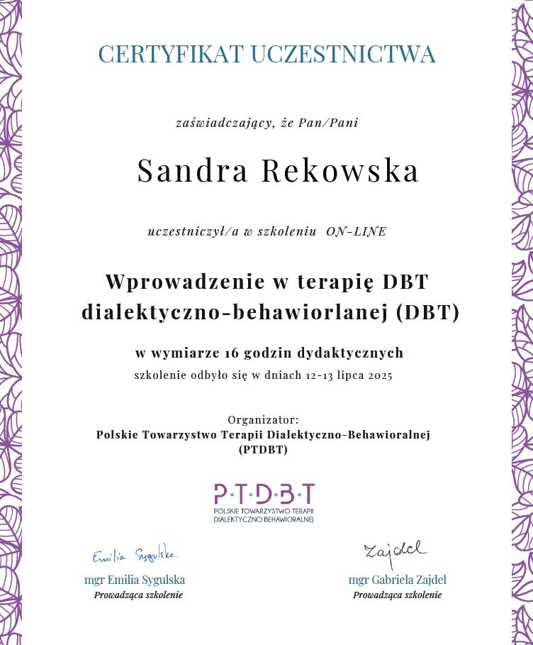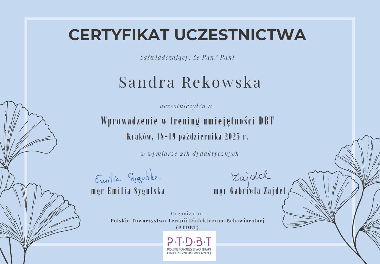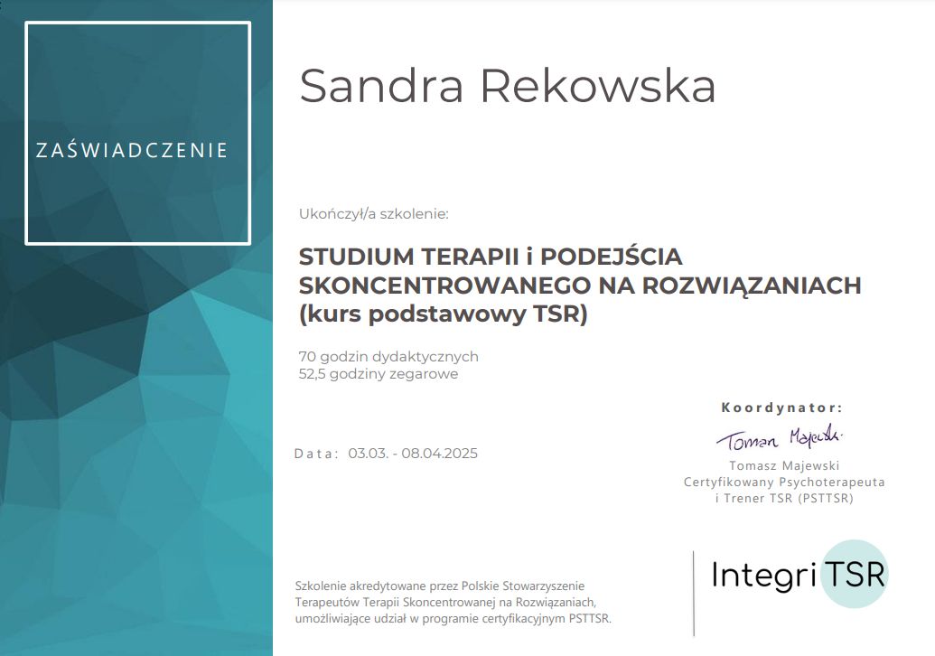 Z pełnym przekonaniem polecam Panią Sandrę. Podczas naszych spotkań zdobyłem wiele cennych umiejętności, które pomagają mi lepiej rozumieć i kontrolować emocje, dzięki czemu nie przejmują one nade mną kontroli.