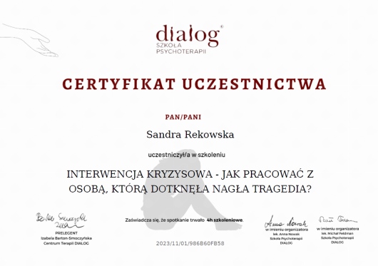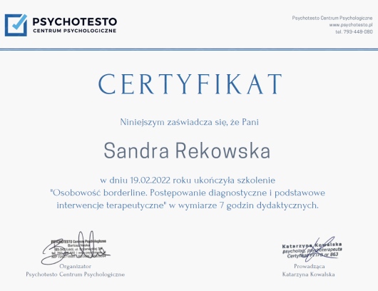 Niesamowicie jestem wdzięczna, że na trudny dla mnie okres trafiłam do Pani Sandry. Spotkania okazały się bardzo pomocne, byłam w stanie bardzo dużo rzeczy zrozumieć sama dzięki słowom Pani Sandry. Szukając dobrego specjalistę, bardzo dużą uwagę zwracam na opinię. Z pewnością chciałabym dołożyć swoją cegiełkę.