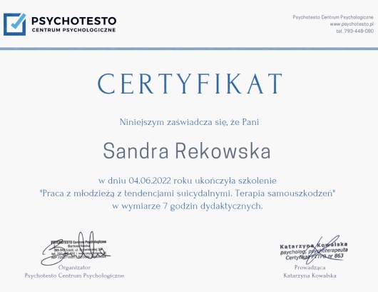 Lepiej nie mogliśmy trafić. Nieoceniona pomoc dla nastolatki. Pani Sandra wykazuje się nie tylko profesjonalizmem, empatią, zrozumieniem, wspaniałymi (niesztampowymi) pomysłami w terapii, ale przede wszystkim jest ogromnym wsparciem w gorszych chwilach. Polecam z czystym sumieniem - bardzo pomogła, a tak naprawdę.., uratowała MOJE DZIECKO..