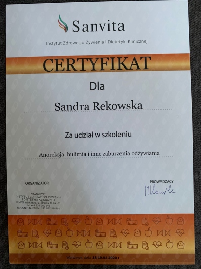 Jaki jest zakres porad oferowanych przez Sandra Rekowska?Sandra Rekowska to psycholog, dietetyk. Na podstawie swojego doświadczenia i wykształcenia Sandra Rekowska oferuje usługi takie jak: Konsultacja psychologiczna, poradnictwo dla rodziców i opiekunów, Wsparcie psychologiczne, konsultacja psychologiczna- zaburzenia odżywiania, Konsultacja psychodietetyczna, diagnoza ADHD dla dorosłych, konsultacja psychologiczna dzieci i młodzieży, psychoedukacja, Diagnoza ADHD dzieci i młodzieży, Konsultacja psychologiczna online.