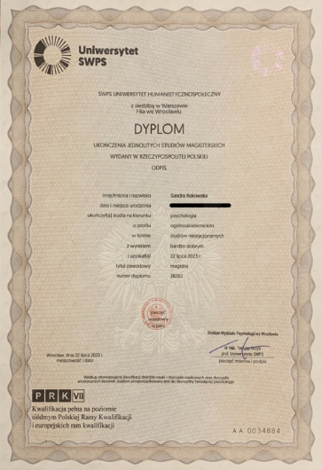 Ukończyłam magisterskie studia na kierunku Psychologia na Uniwersytecie SWPS we Wrocławiu oraz roczny kurs Interwencji Kryzysowej w Instytucie Pomocy Psychologicznej, ITPB we Wrocławiu. Zawód dietetyka zdobyłam podczas studiów na Uniwersytecie Medycznym im. Piastów Śląskich we Wrocławiu. Doświadczenie zawodowe zdobywałam m.in. w Centrum Pomocy Psychologicznej, gdzie wspierałam osoby zmagające się z kryzysami, tj. żałoba, utrata zdrowia. W Dziennym Ośrodku Psychiatrii i Zaburzeń Mowy dla Dzieci i Młodzieży towarzyszyłam dzieciom w wieku przedszkolnym w codziennych zajęciach edukacyjnych i terapeutycznych. W Sieci Przyjaciół Zdrowia Psychicznego wspierałam osoby zmagające się z zaburzeniami nastroju, przemocą domową/rówieśniczą czy kryzysami rozwojowymi. W Fundacji Opieka i Troska prowadziłam zajęcia z osobami dorosłymi, m.in. psychoedukację, psychodietetykę, kulinoterapię i interwencję kryzysową. Na co dzień pracuję jako psycholog dziecięcy w Fundacji Promyk Słońca, prowadząc indywidualną terapie psychologiczną wspierającą funkcjonowanie dzieci od urodzenia do czasu podjęcia nauki szkolnej.