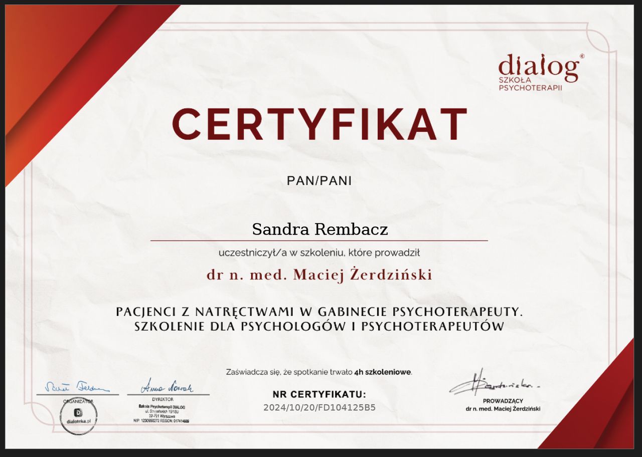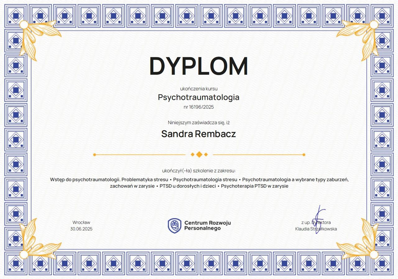 Jestem ogromnie wdzięczna za 2,5 roku terapii z panią Sandrą – to jeden z najlepiej wykorzystanych okresów w moim życiu. Pani Sandra to profesjonalistka, która z empatią i zrozumieniem prowadzi terapię, oferując wsparcie w najtrudniejszych chwilach. Dzięki jej podejściu nauczyłam się rozpoznawać i przepracowywać własne schematy, co pozwoliło mi lepiej zrozumieć siebie. Terapia pomogła mi zadbać o siebie, stawiać granice i z większą uważnością podchodzić do swoich potrzeb. Dzięki niej poczułam się silniejsza i bardziej łagodna dla siebie. To czas, który realnie wpłynął na jakość mojego życia, dając narzędzia do radzenia sobie z emocjami. Z całego serca polecam panią Sandrę każdemu, kto chce lepiej poznać siebie i zadbać o swoje zdrowie psychiczne.