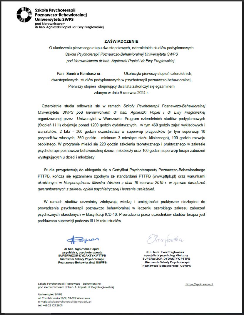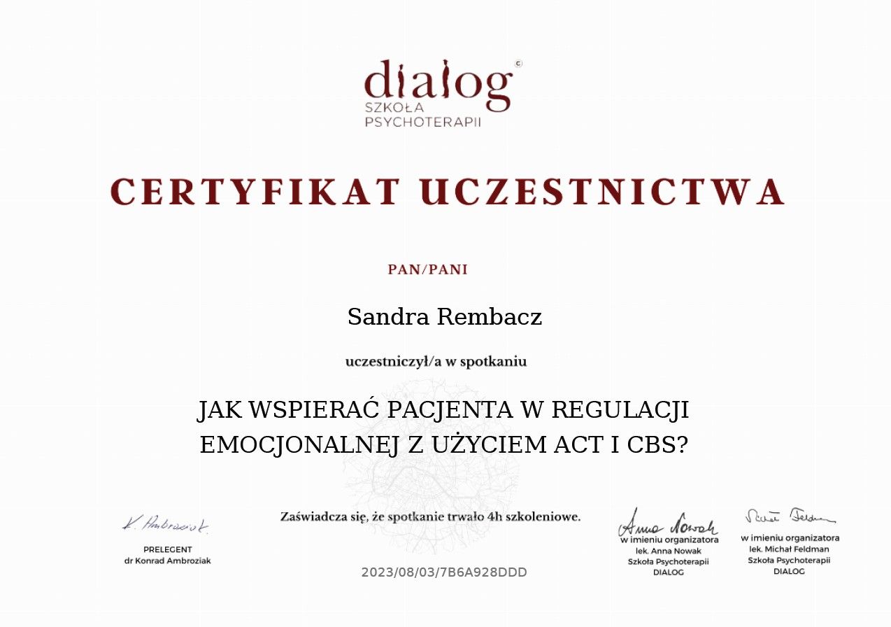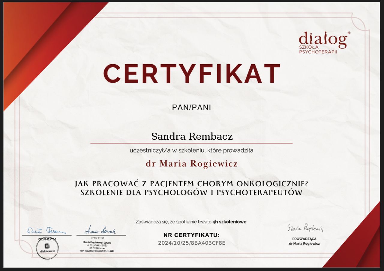Po zakończonym procesie psychoterapii mogę śmiało powiedzieć – to była jedna z najlepszych decyzji w moim życiu. Dzięki Pani Sandrze nauczyłam się rozumieć i akceptować swoje emocje, dbać o siebie i budować wartościowe relacje. Zyskałam nowe spojrzenie na świat i siłę, by iść przez życie w zgodzie ze sobą. Pełen profesjonalizm, ciepło i zrozumienie sprawiły, że każda sesja była krokiem w stronę lepszego życia. Jeśli ktoś szuka wyjątkowego terapeuty, serdecznie polecam!