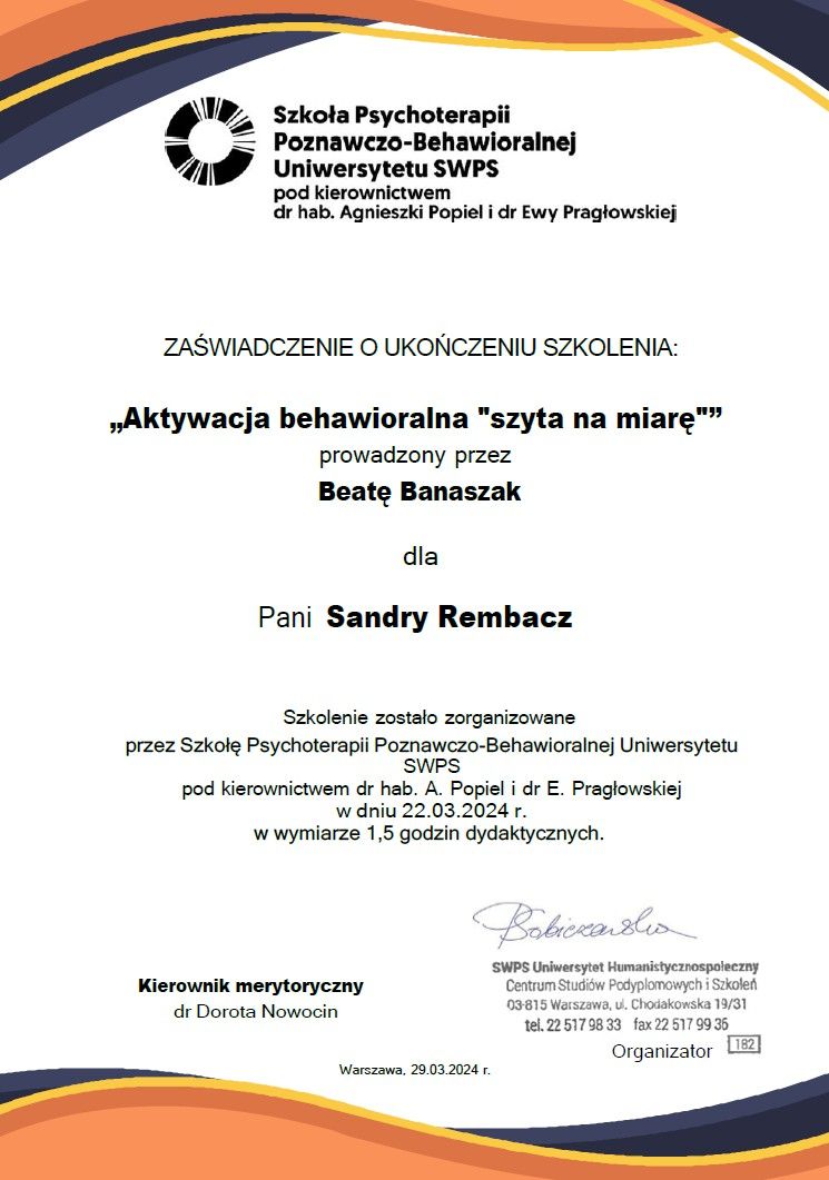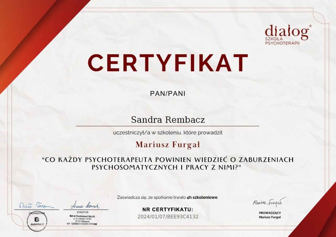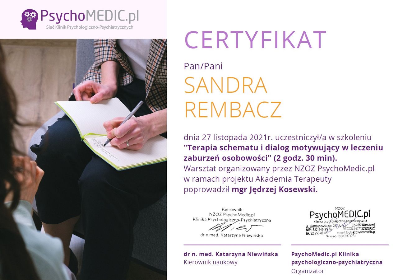 Po zakończonym procesie psychoterapii mogę śmiało powiedzieć – to była jedna z najlepszych decyzji w moim życiu. Dzięki Pani Sandrze nauczyłam się rozumieć i akceptować swoje emocje, dbać o siebie i budować wartościowe relacje. Zyskałam nowe spojrzenie na świat i siłę, by iść przez życie w zgodzie ze sobą. Pełen profesjonalizm, ciepło i zrozumienie sprawiły, że każda sesja była krokiem w stronę lepszego życia. Jeśli ktoś szuka wyjątkowego terapeuty, serdecznie polecam!